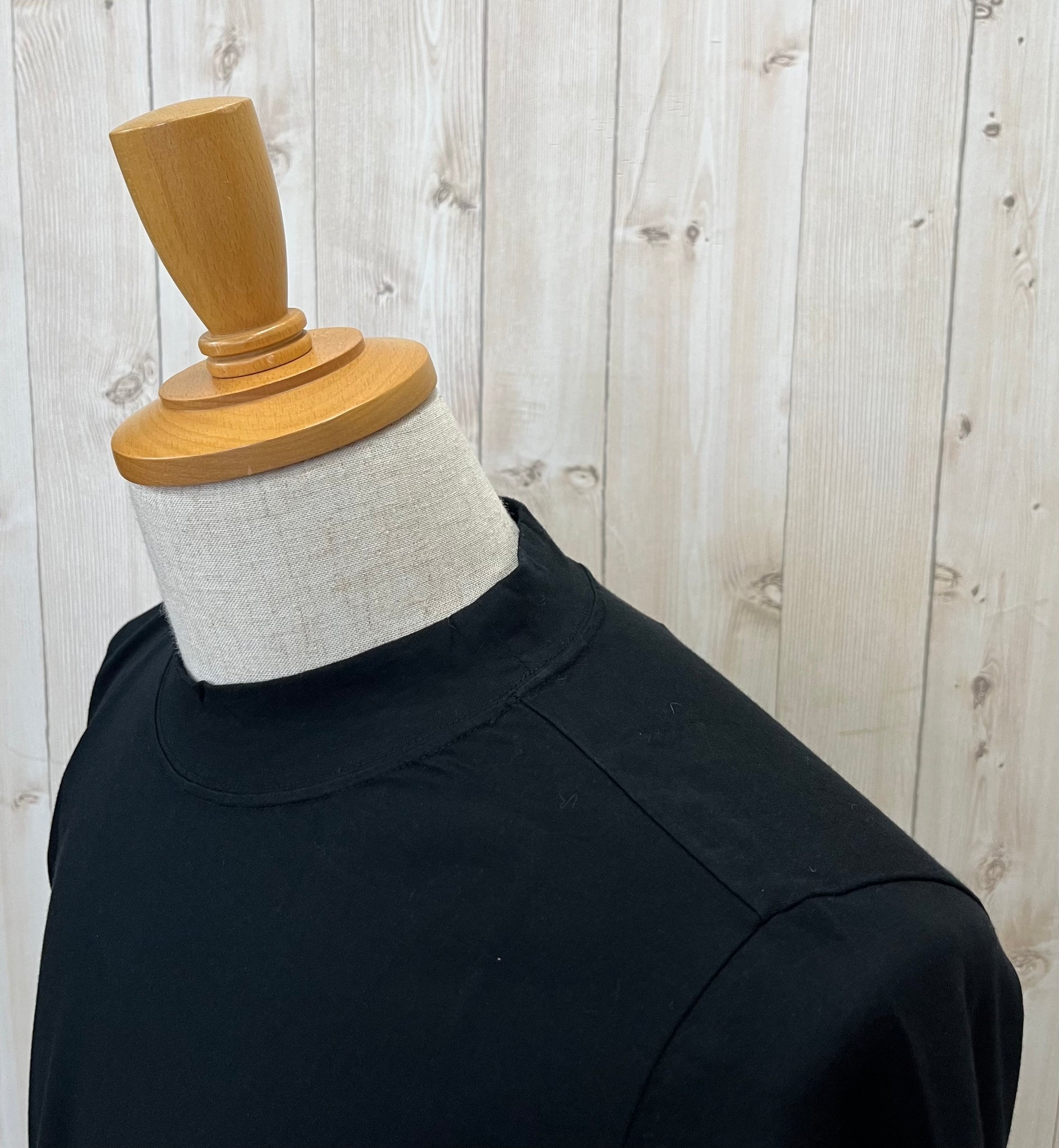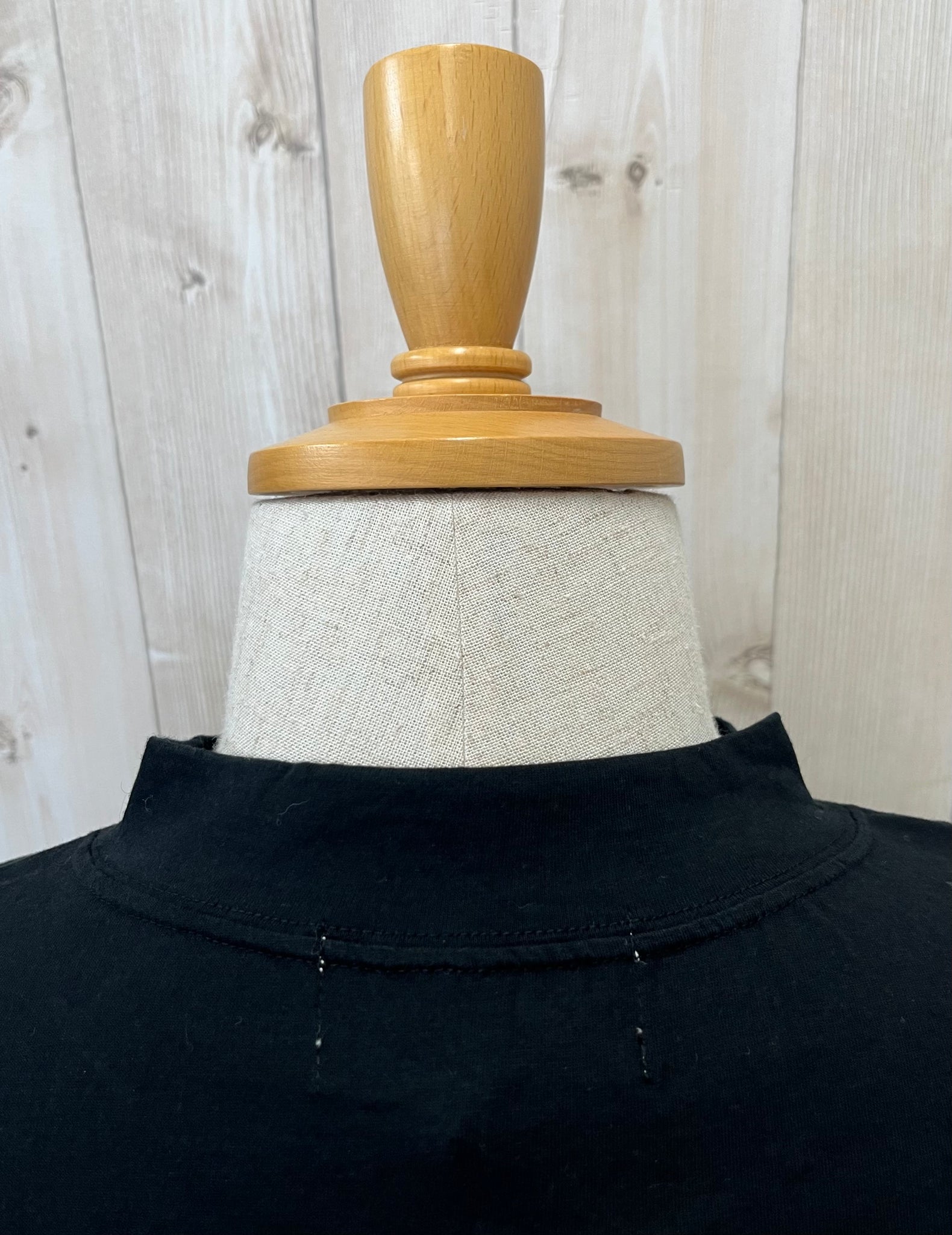 首元に立体感のあるハイネック、身幅はゆったりと身体のラインを拾いすぎないシルエットです