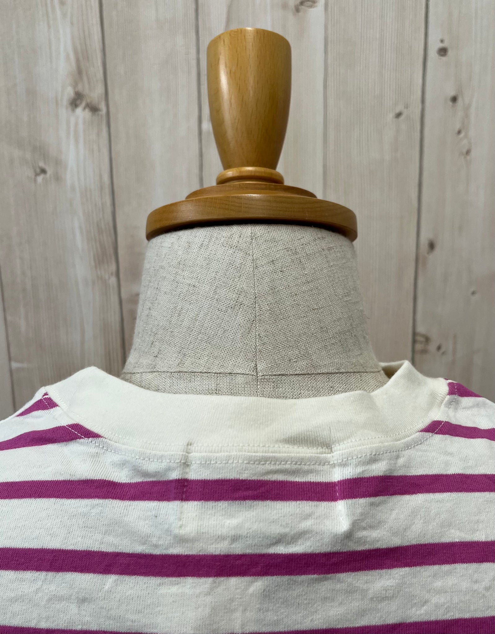 天巾が広すぎず、首元をすっきりとみせてくれるボートネックの長袖Tです