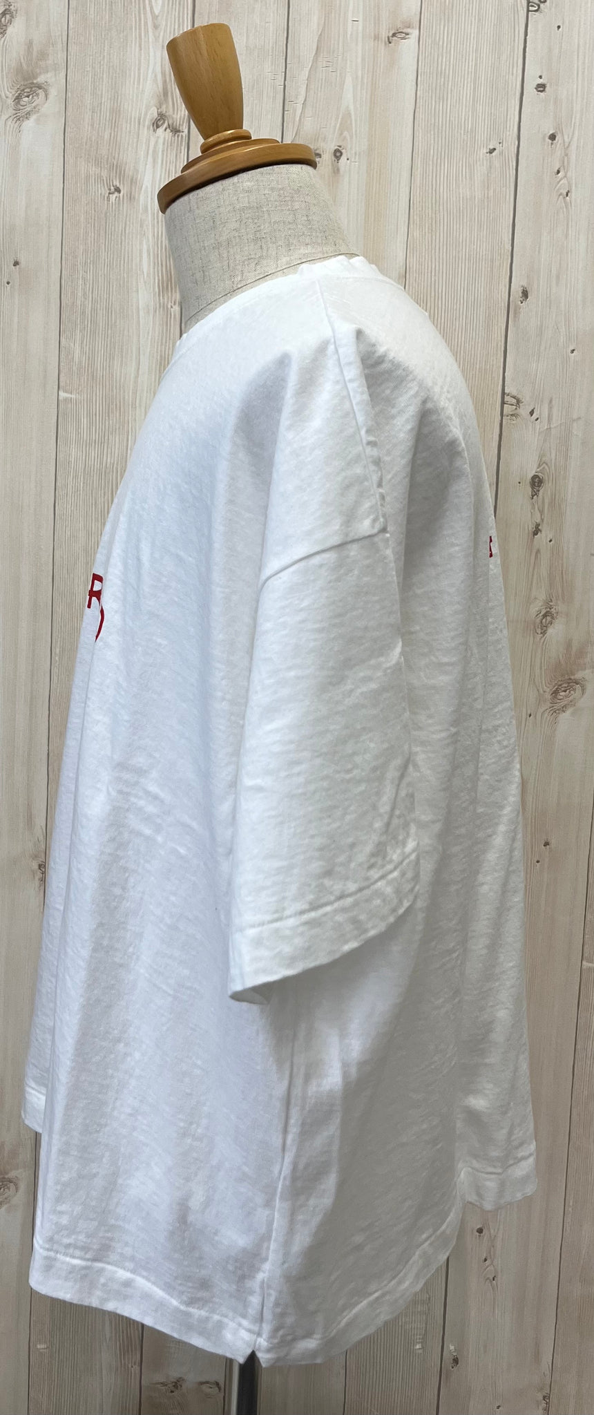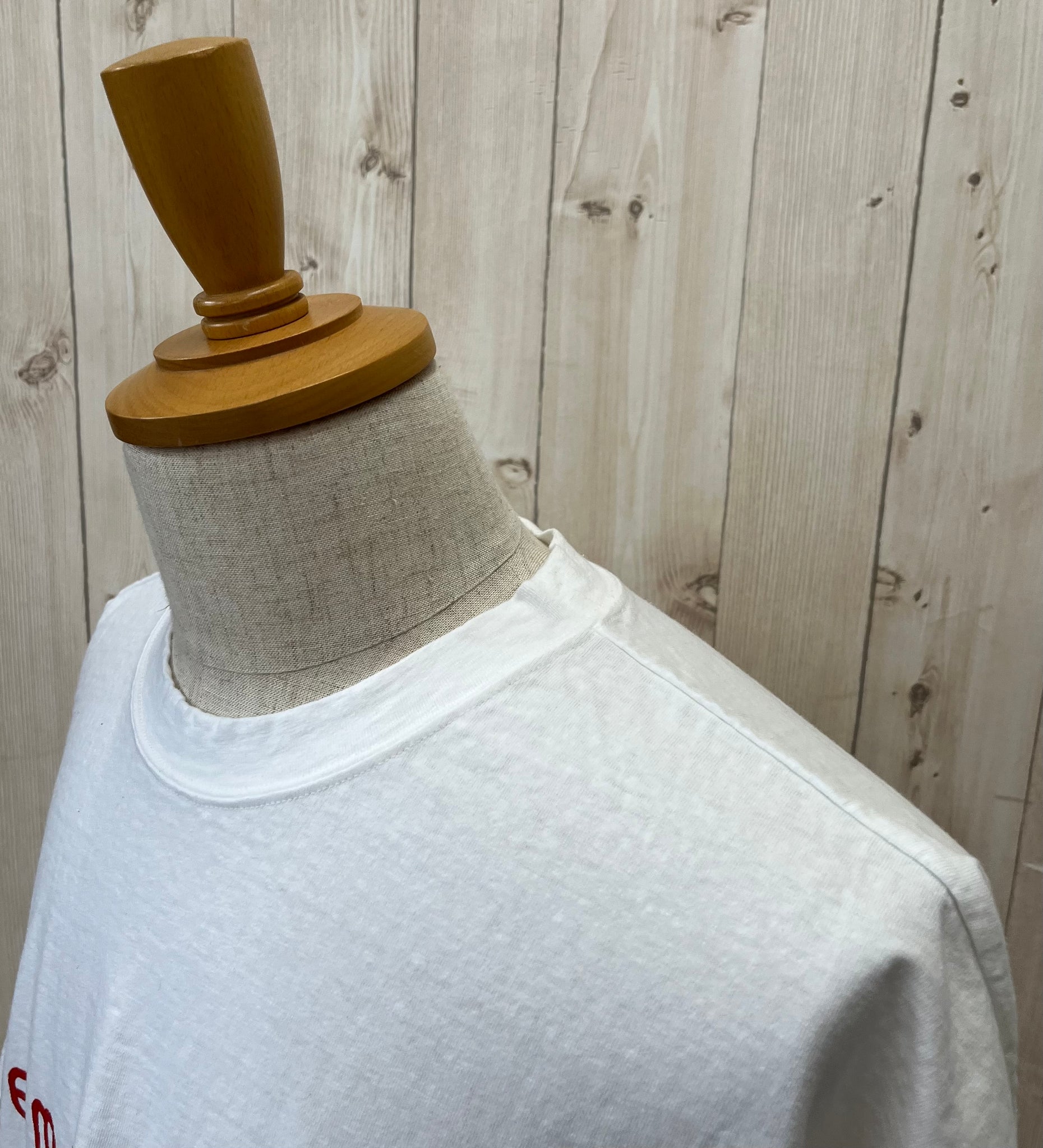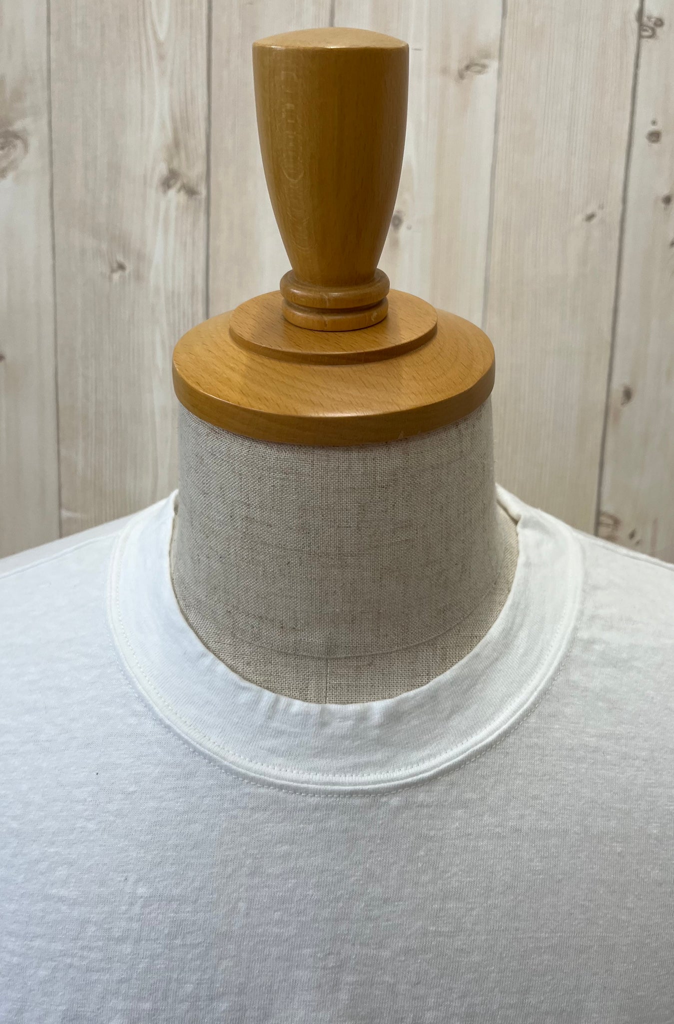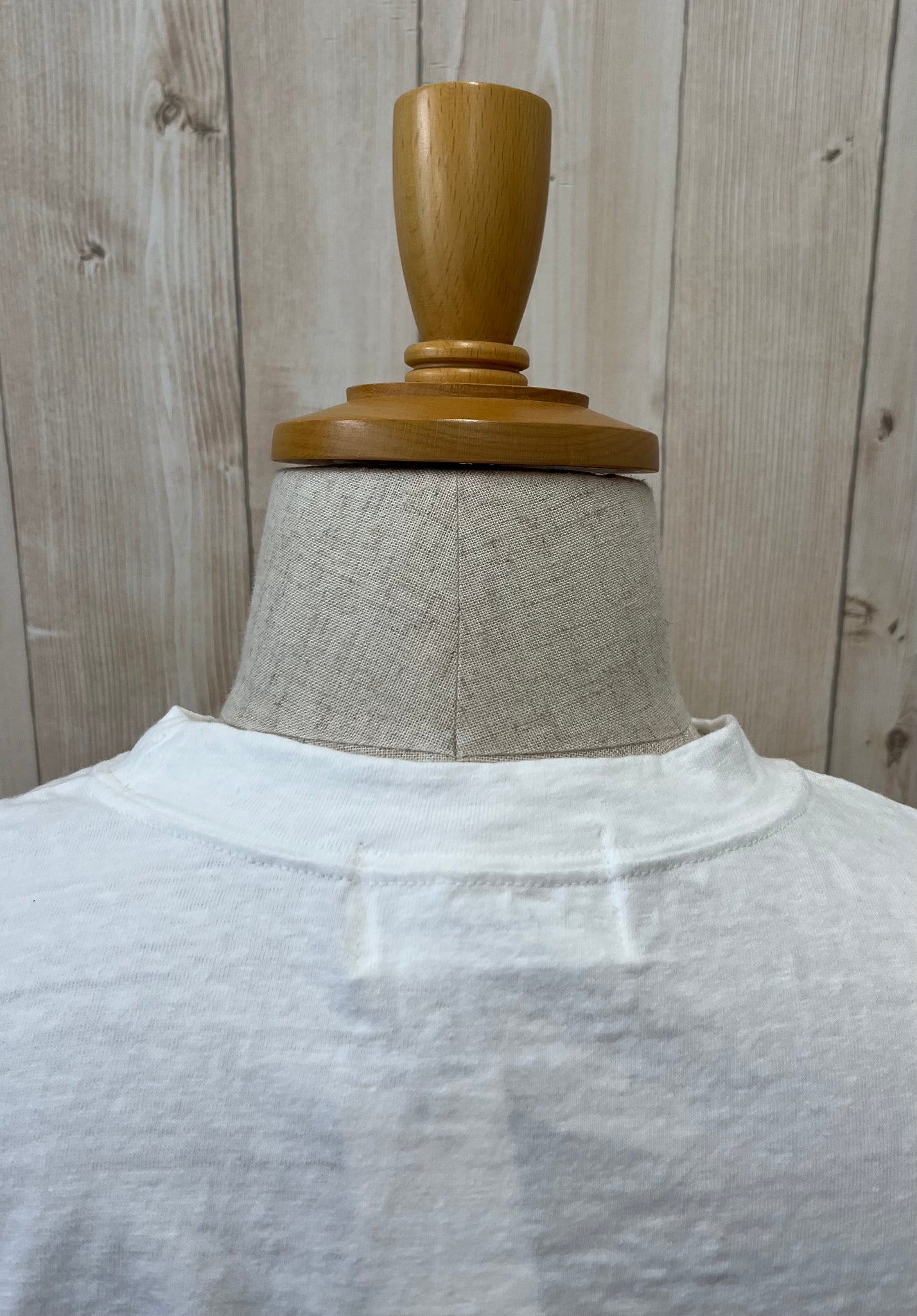 ワイドなサイジングで、襟ぐりの開きは首に沿うクルーです
