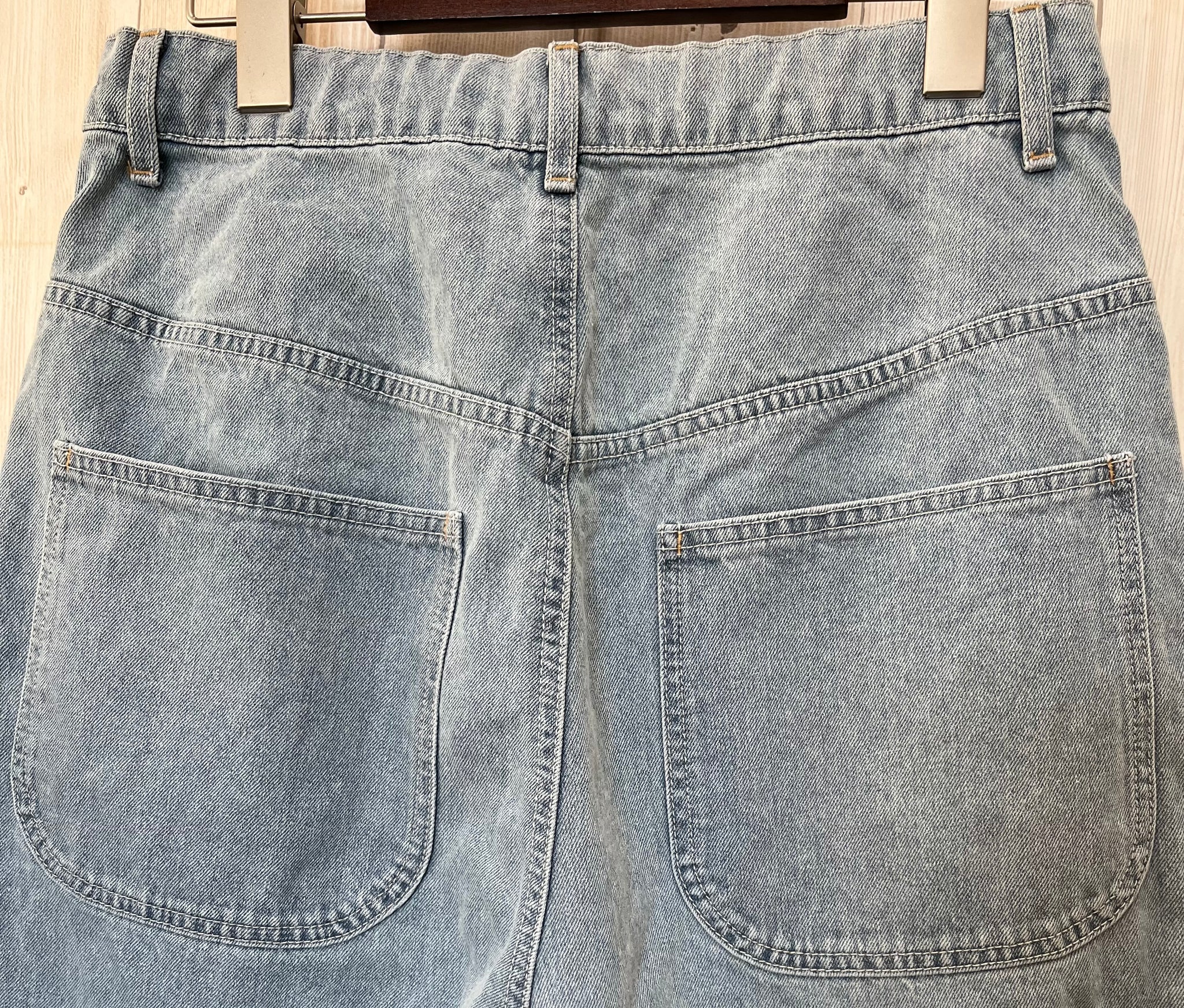 ウエスト後ろ部分に入っているゴムと両サイドに付いているボタンでサイズ調節が可能です