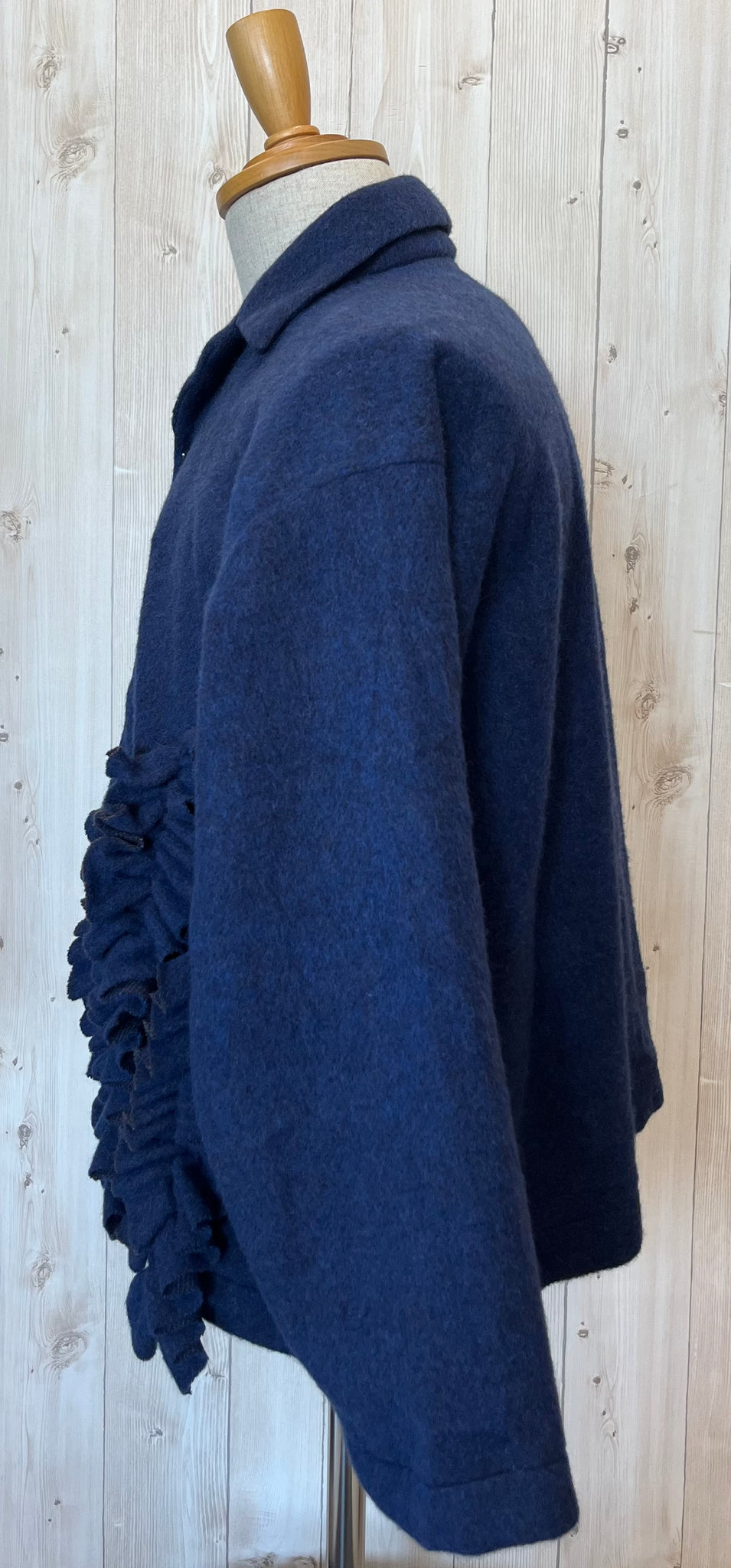 フロントにあしらわれたボディと同色フリルが大人可愛いく存在感のあるジャケットです