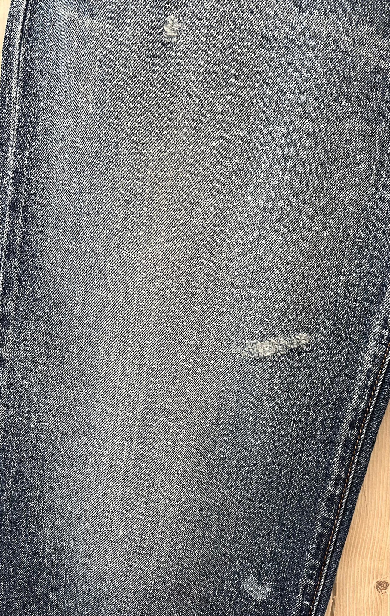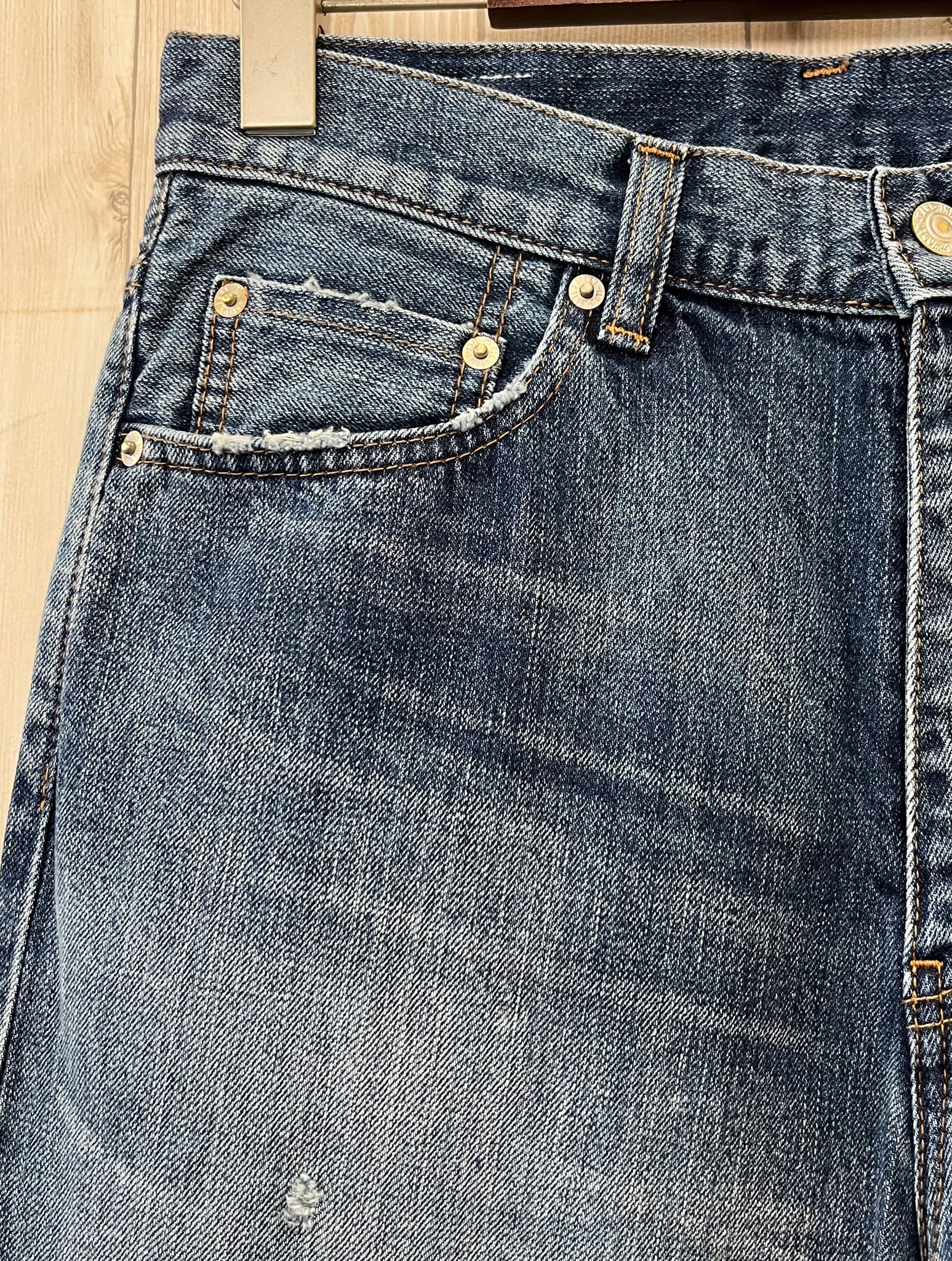 年齢性別問わずに穿きやすく考えられた定番シルエットで、ヒゲ、シェービング、汚し、ダメージ加工を施しヴィンテージデニムの雰囲気を細部まで再現した一着です