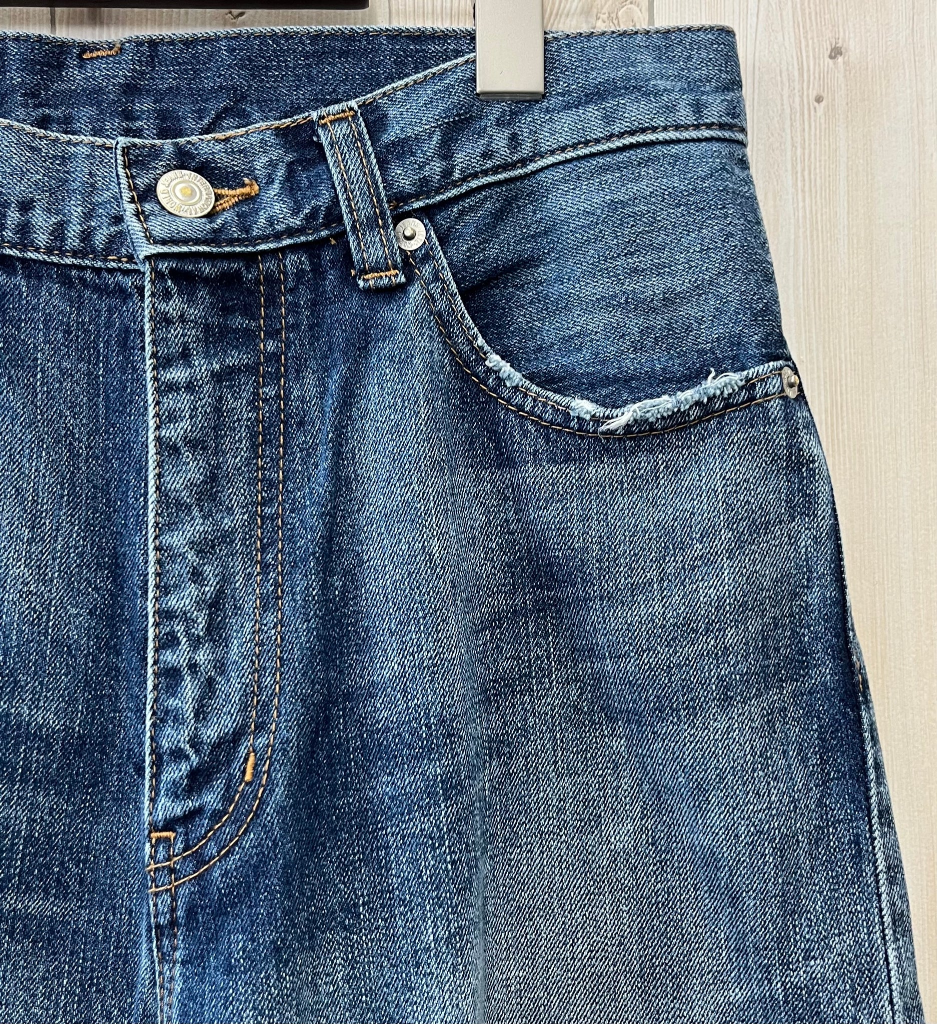 程よい厚みの12オンスのセルヴィッチデニムを使用しており、脇には特徴でもあるセルヴィッチの耳を活かしたアタリ感がアクセントに