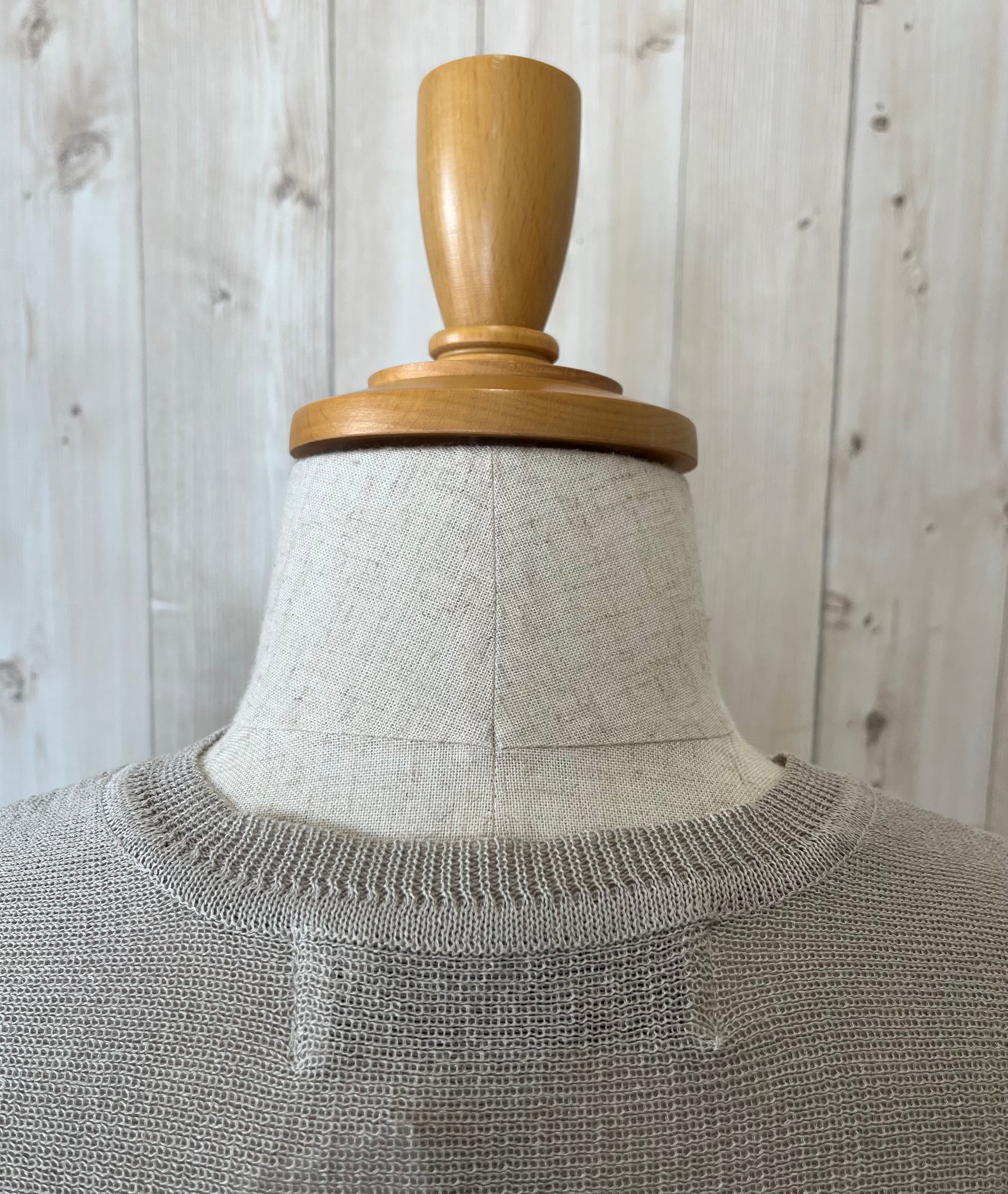 肩ヨークやAH、袖口は微配色の総針組織で編み上げられています