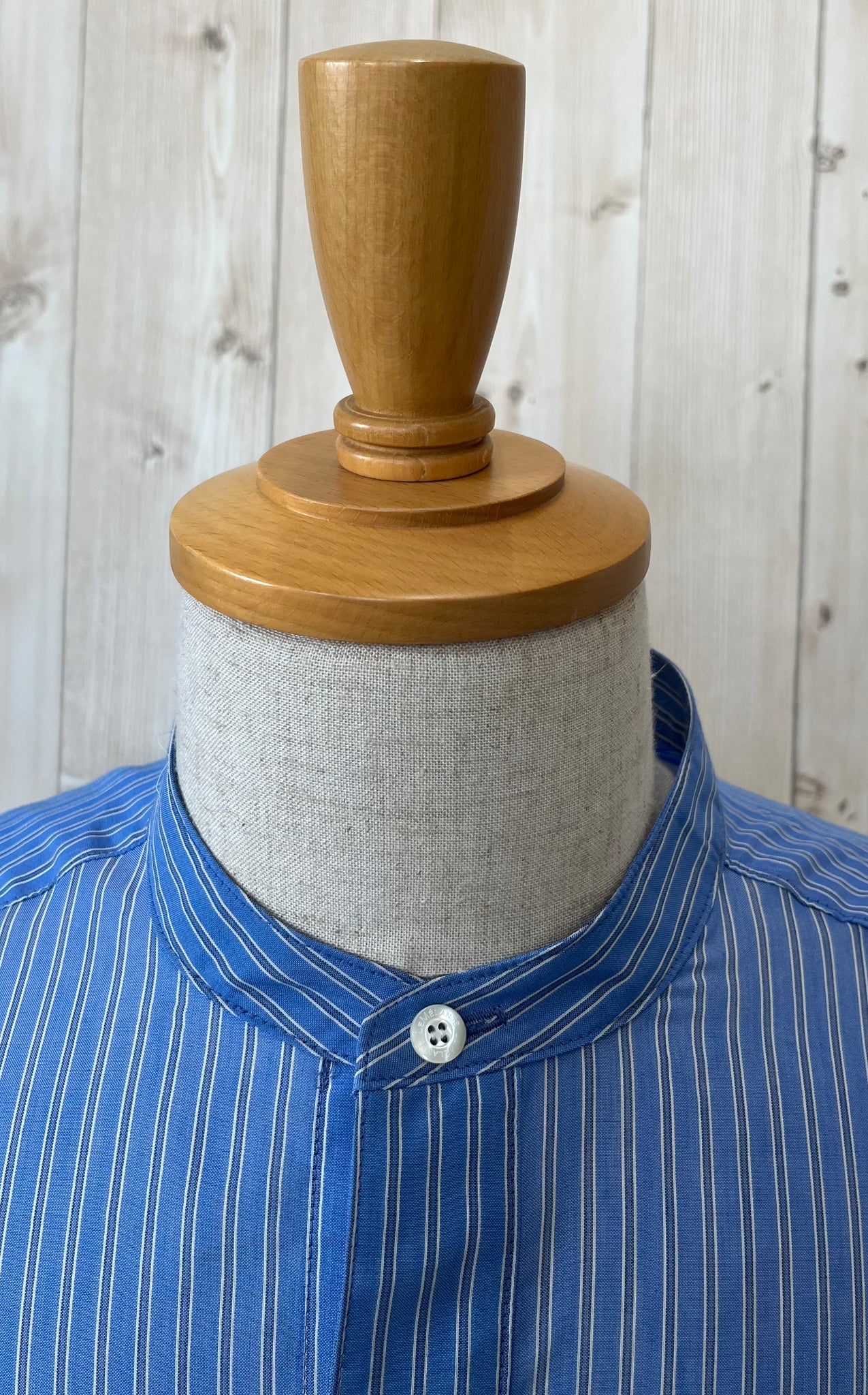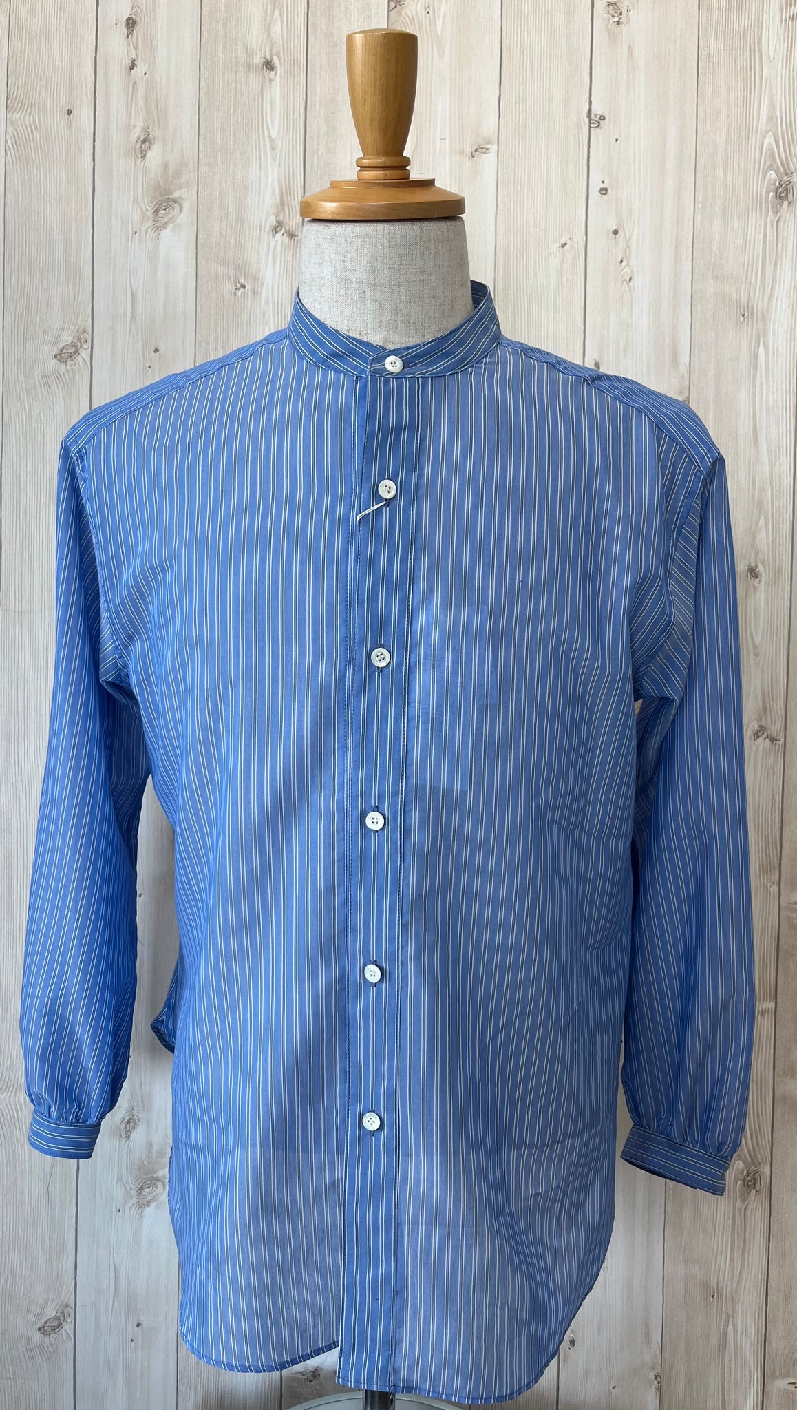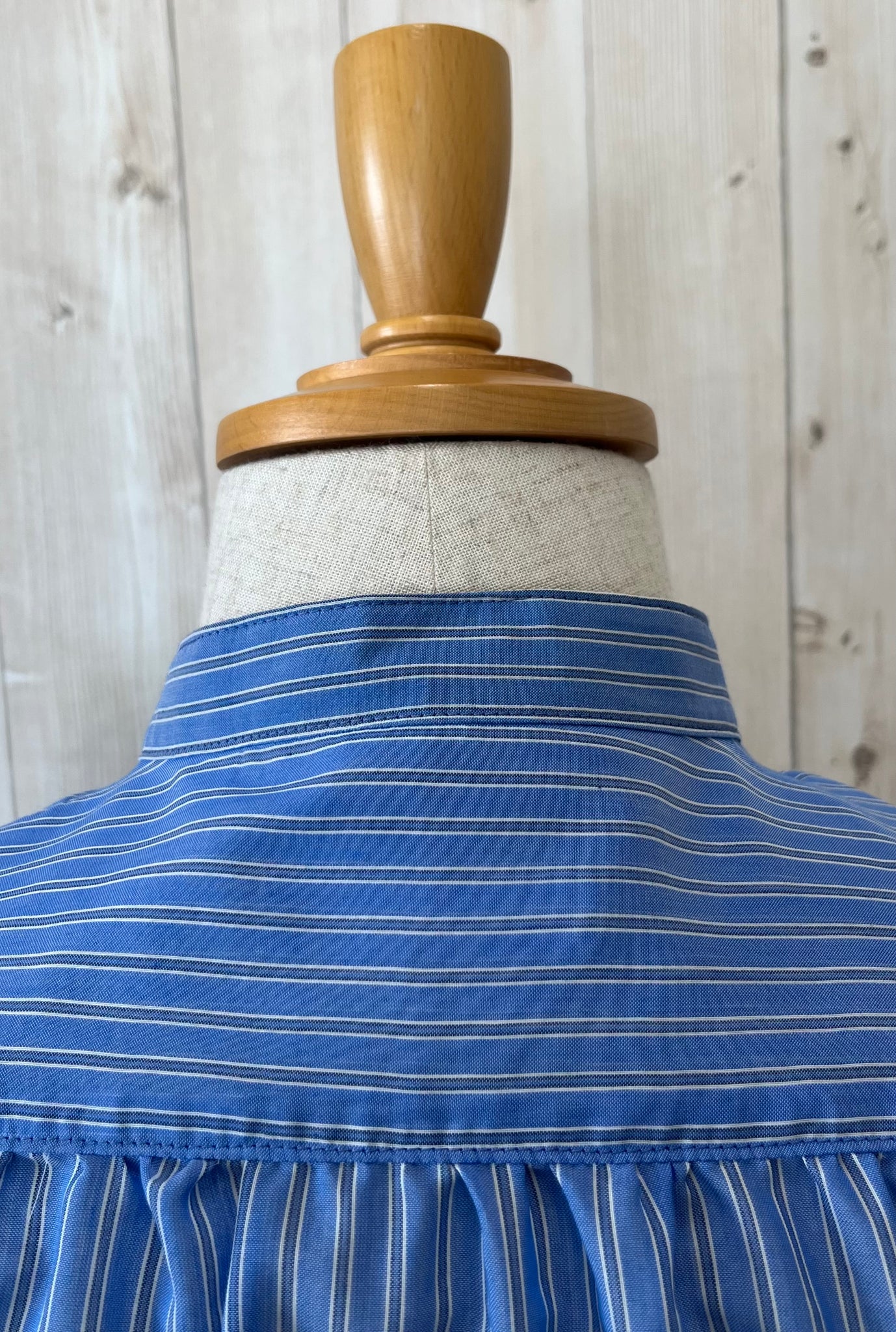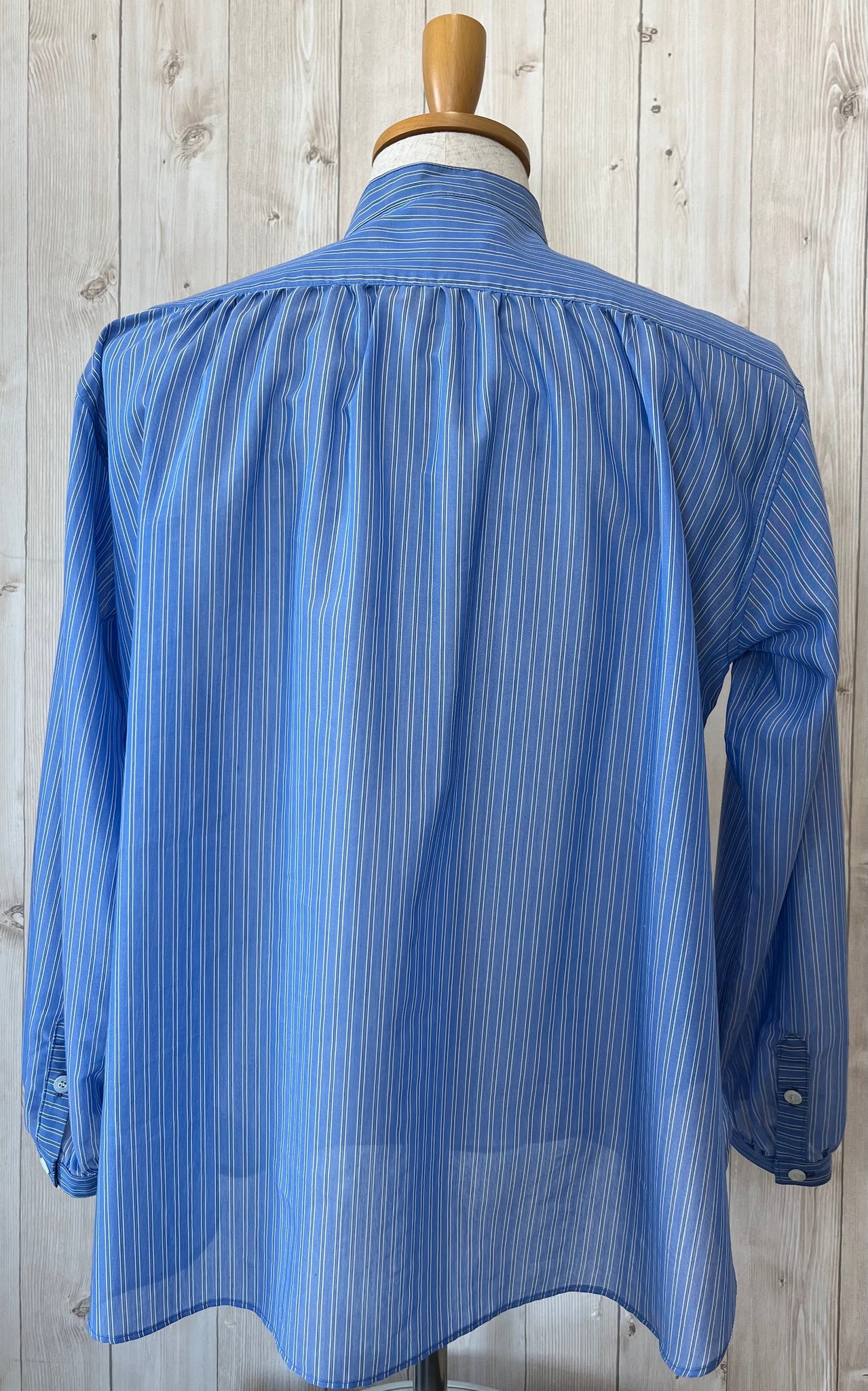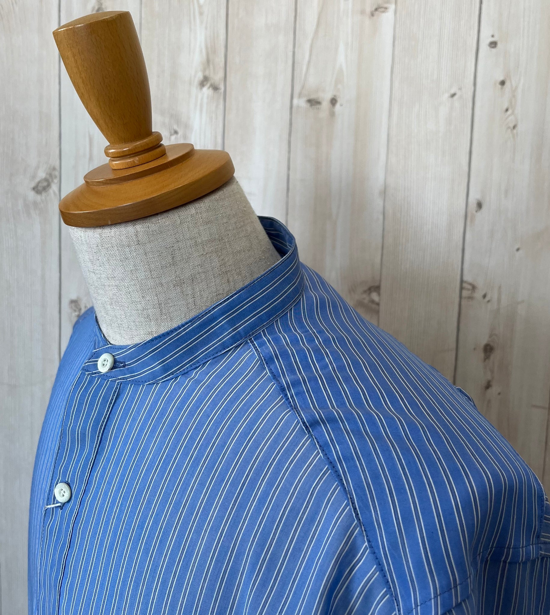 背中にギャザーを施したオーバーサイズのスタンドカラーシャツです