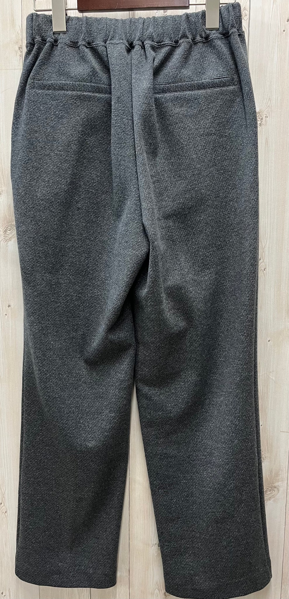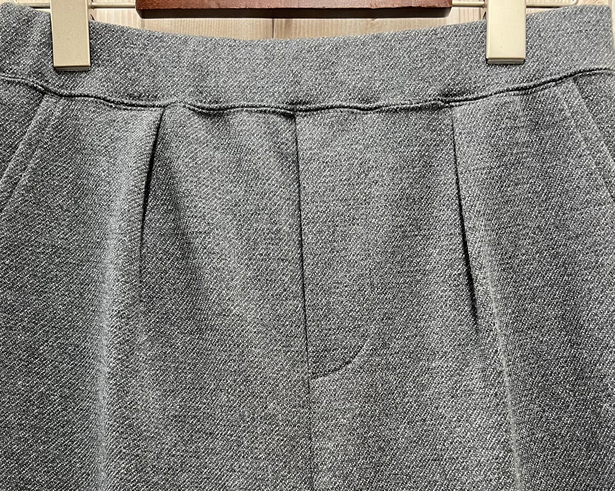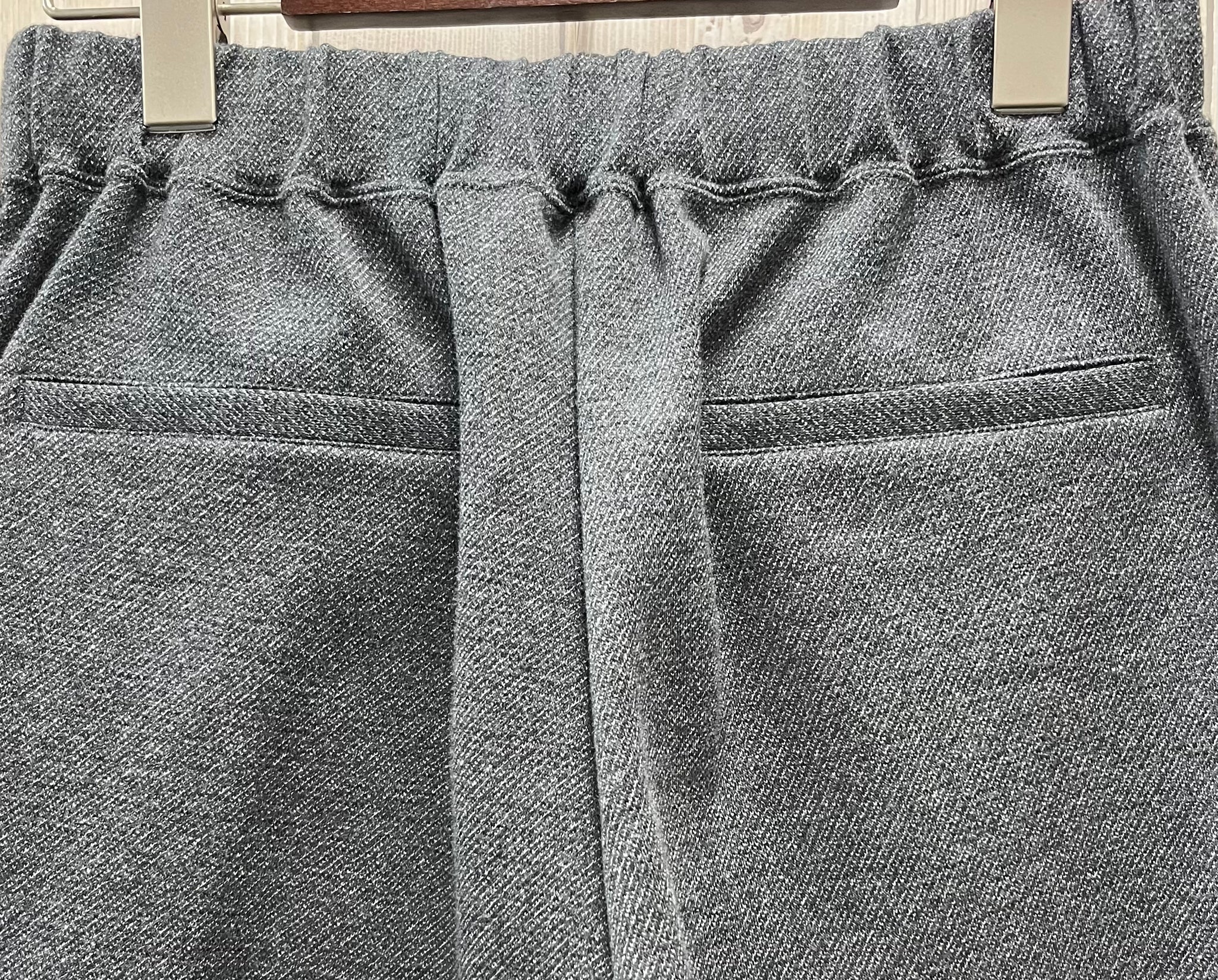 ウエスト総ゴムひもですが、前はゴムを寄せていないのでベルトがスッキリときれいな仕様です