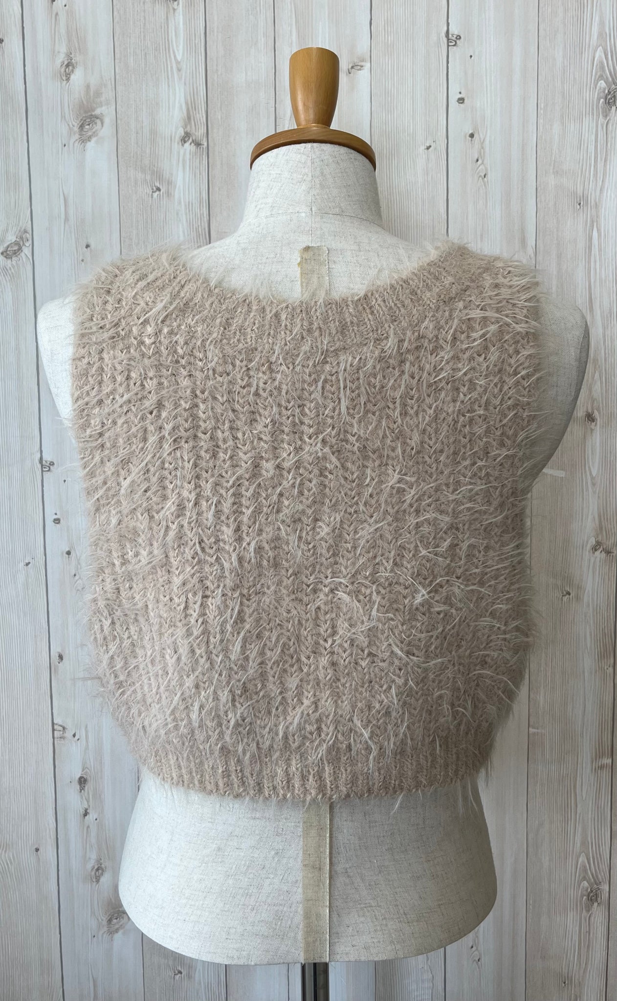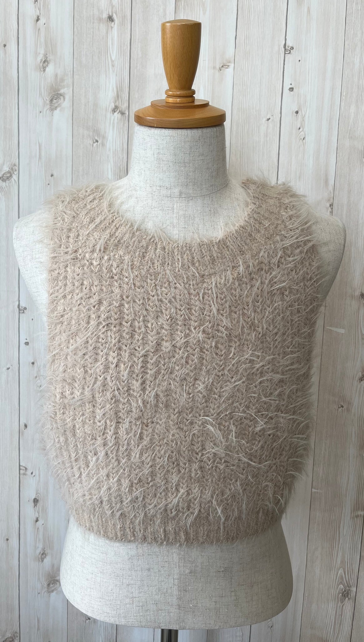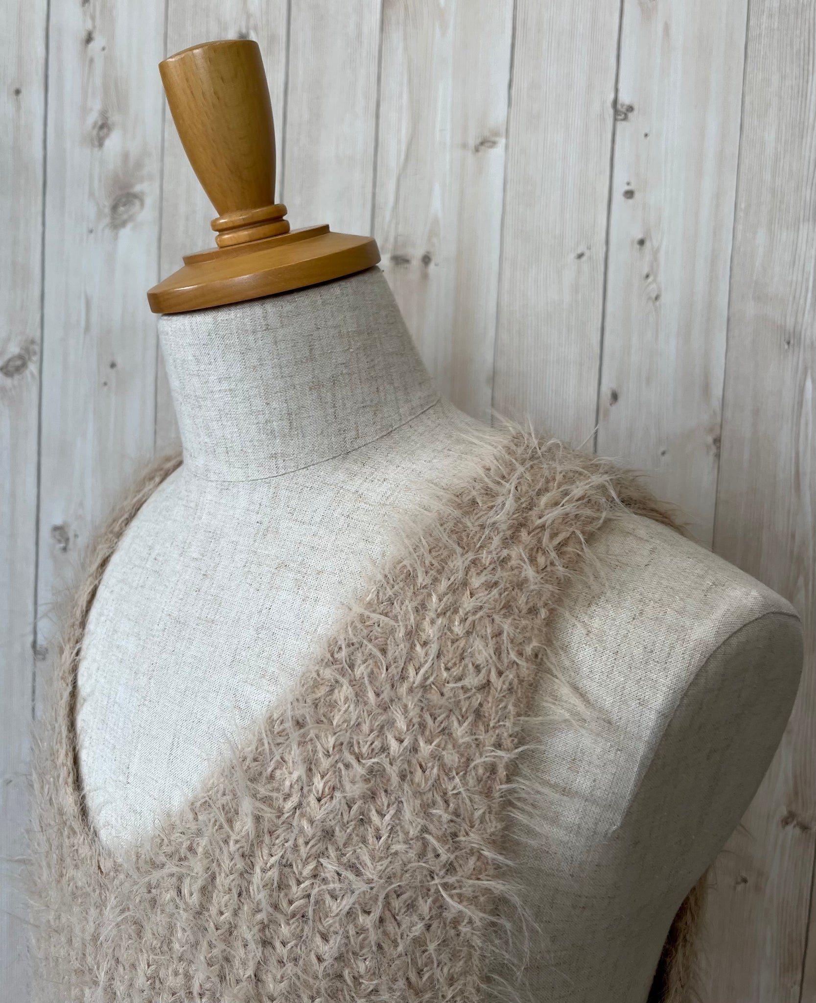 ウール混の膨らみのある太糸と、毛足の長いナイロン糸を引き揃えて、片畦編みしています