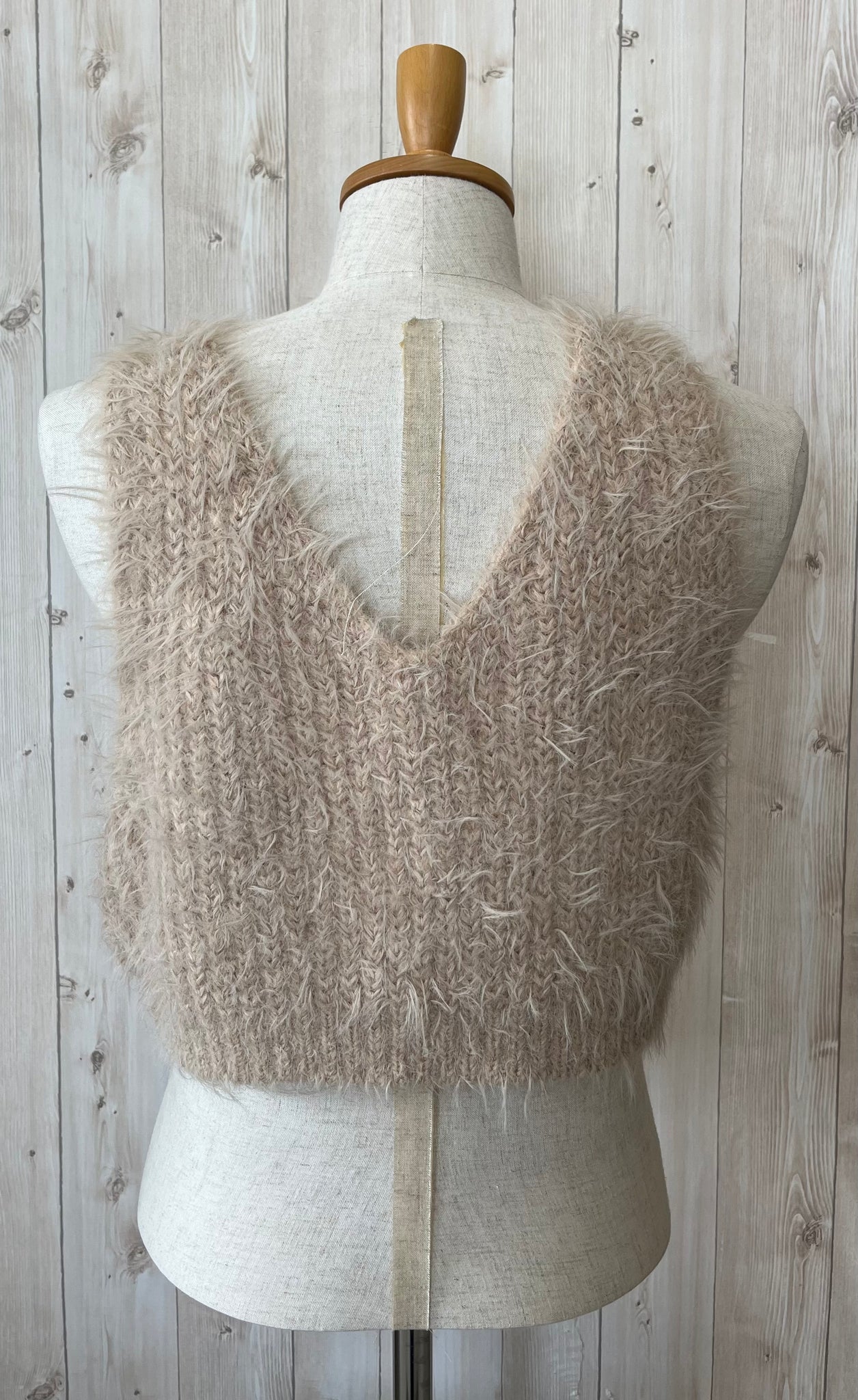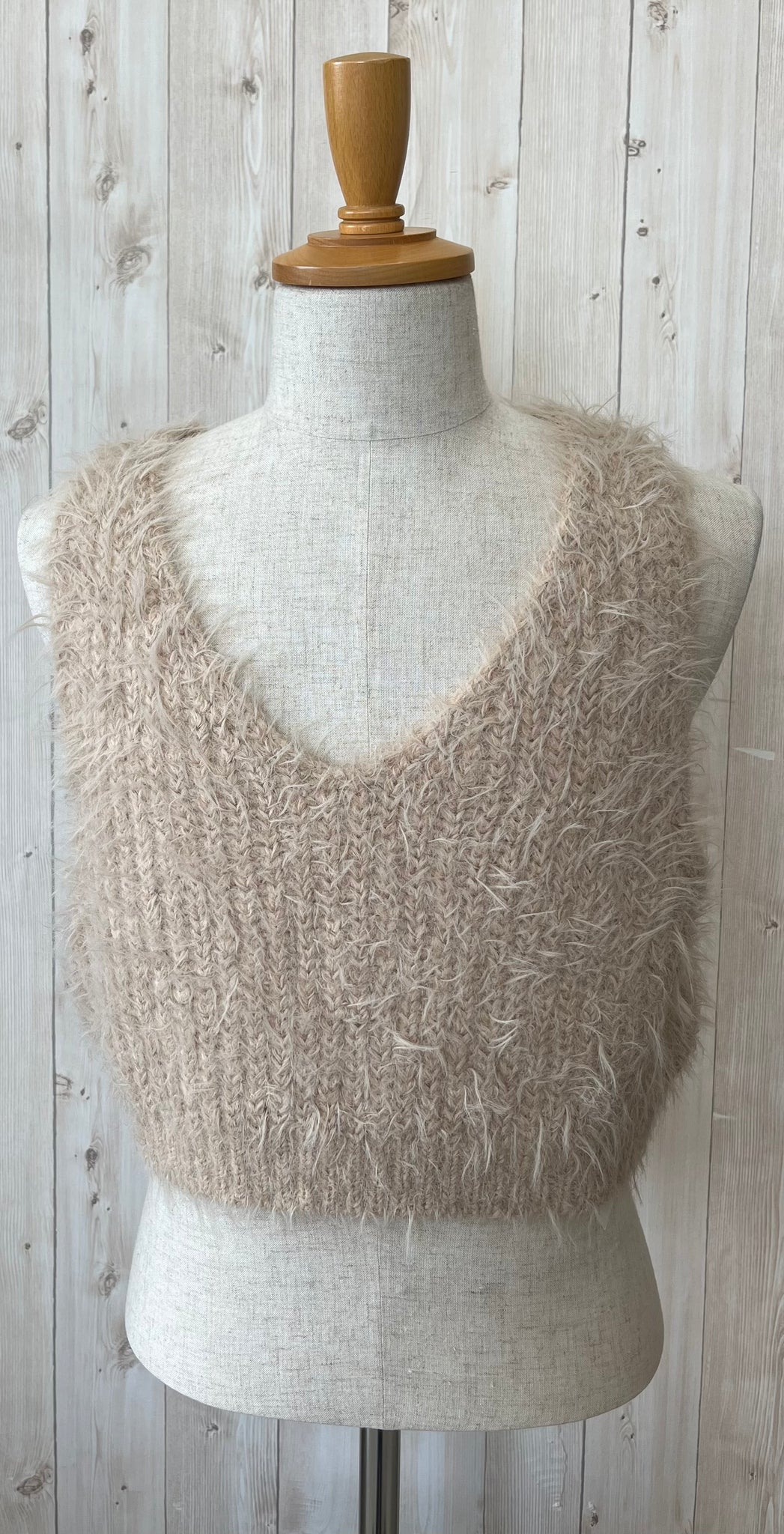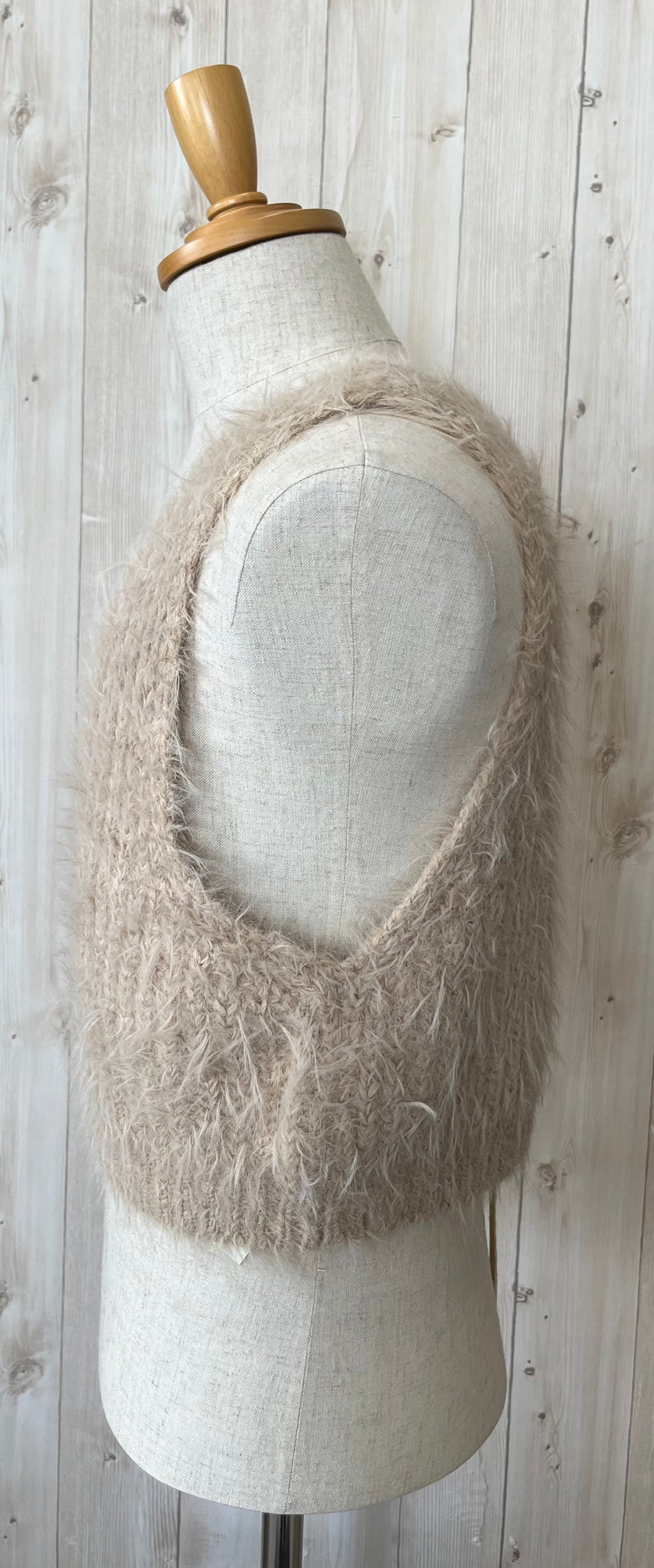 ウール混の膨らみのある太糸と、毛足の長いナイロン糸を引き揃えて、片畦編みしています