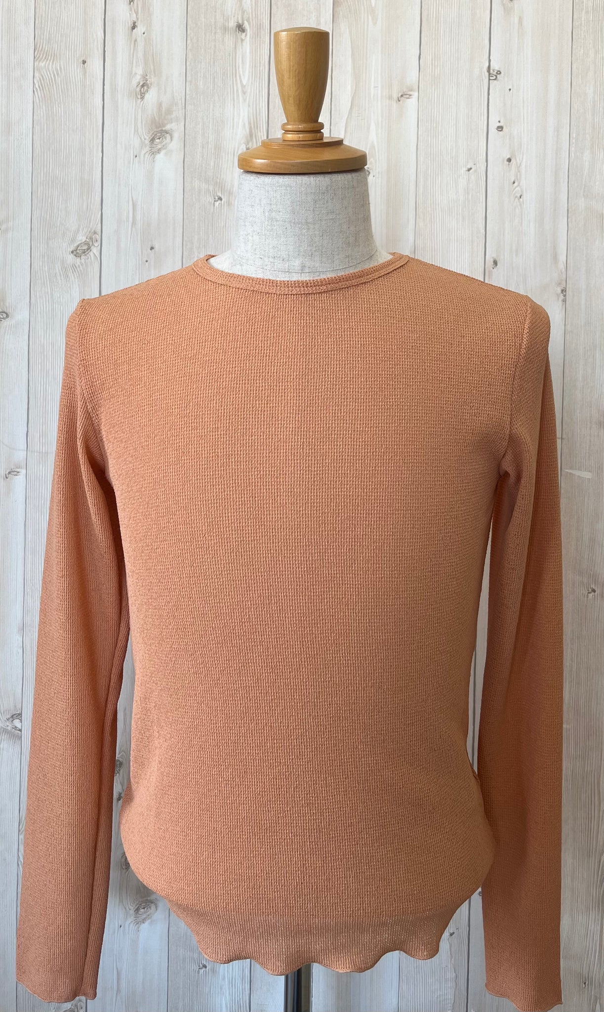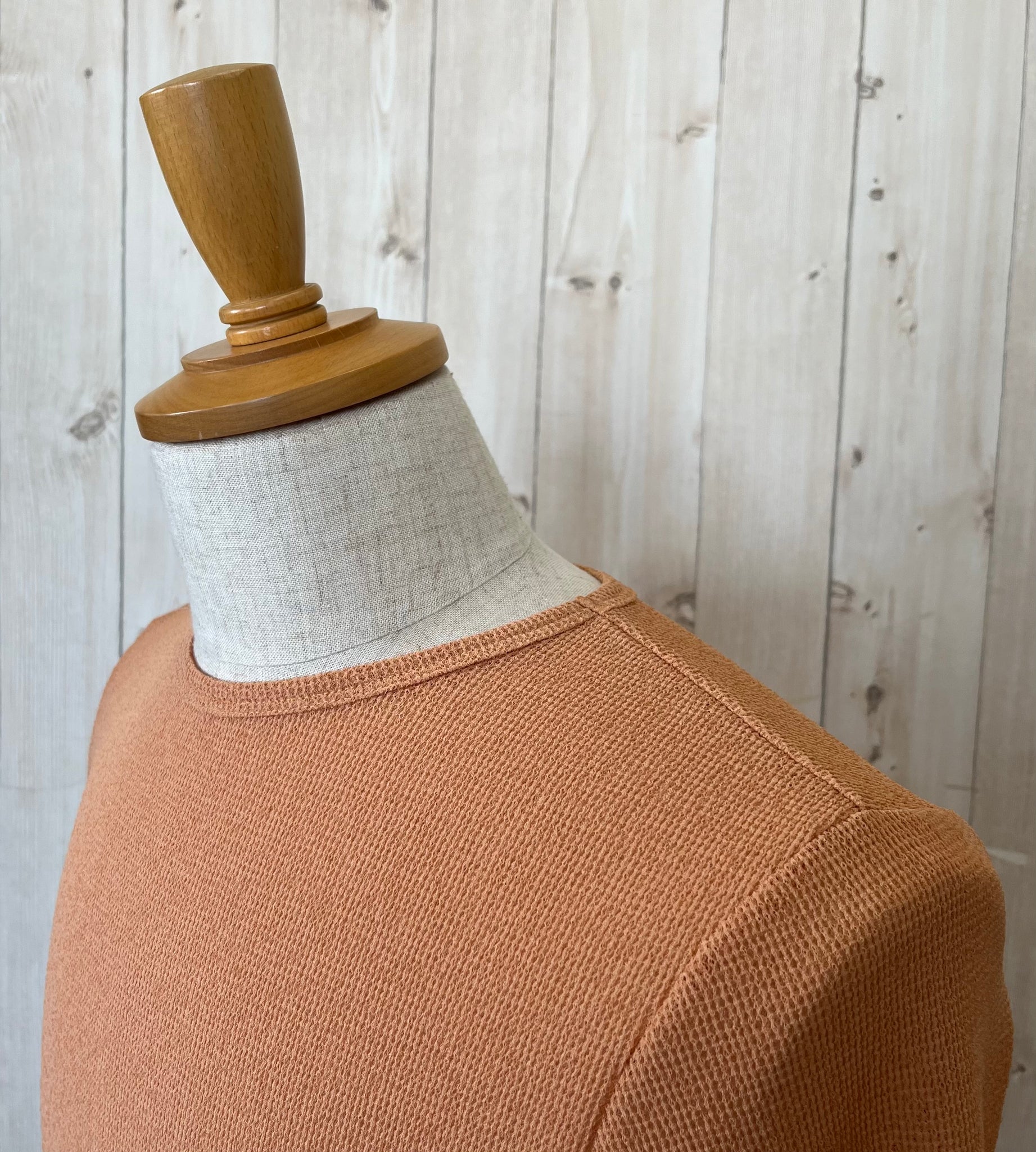 ランダムに撚ったポリエステル糸を部分的に硬化させ、麻のような風合いに編み上げたワッフル素材