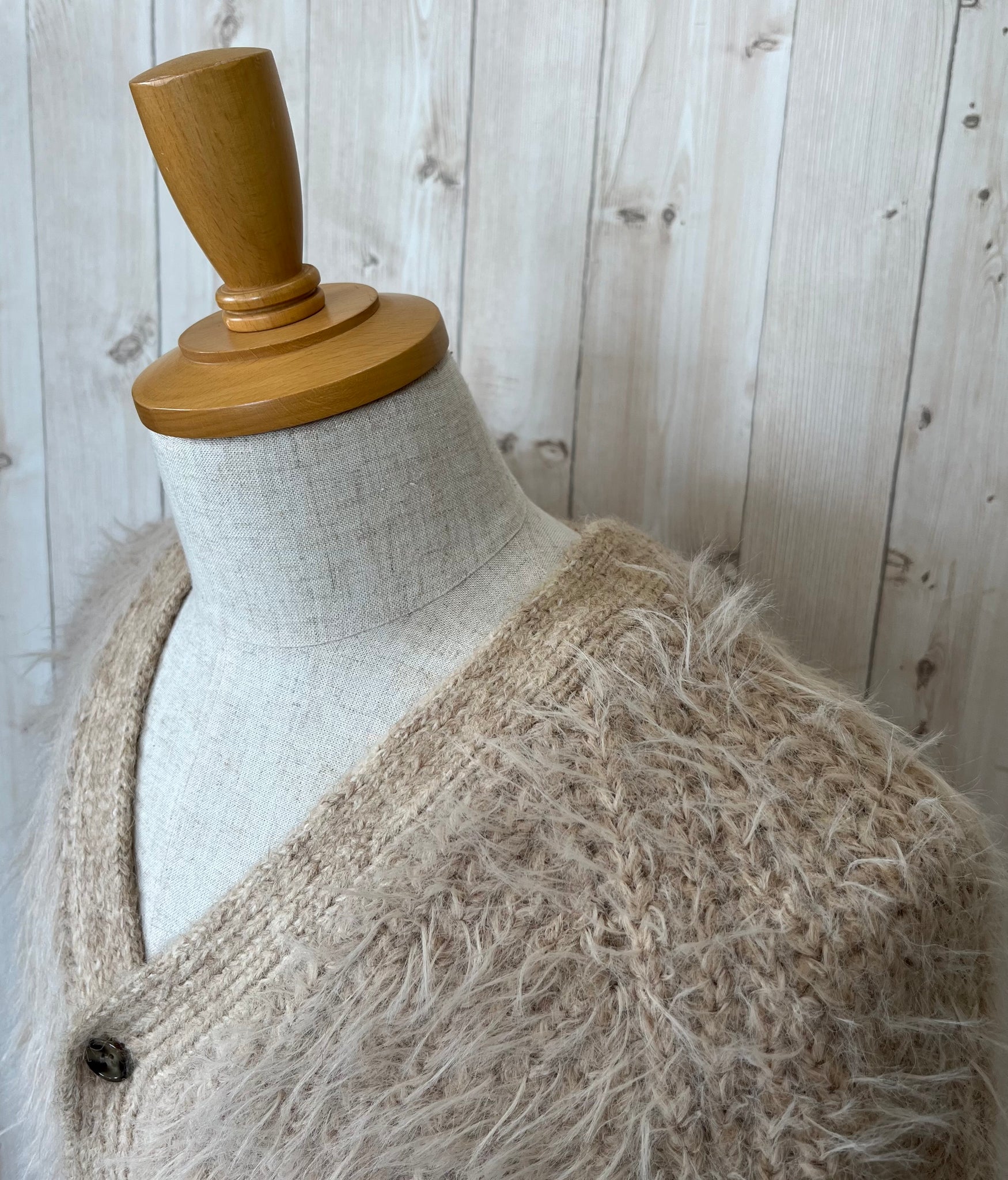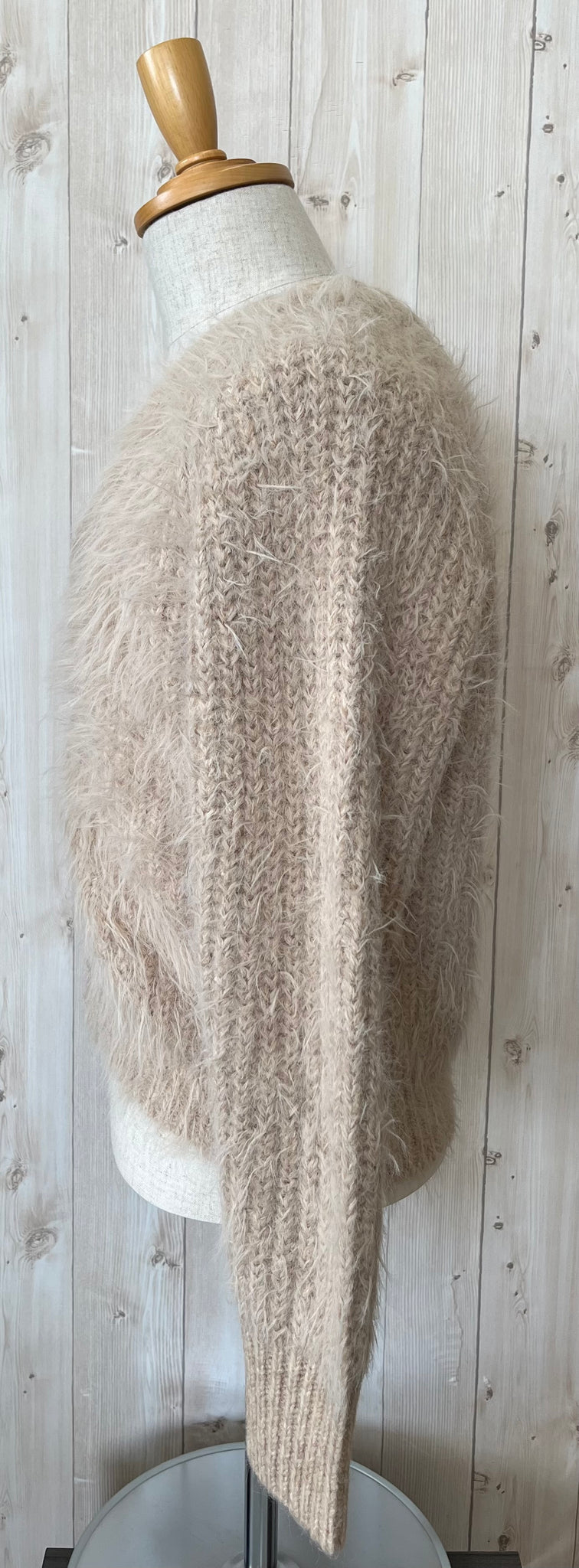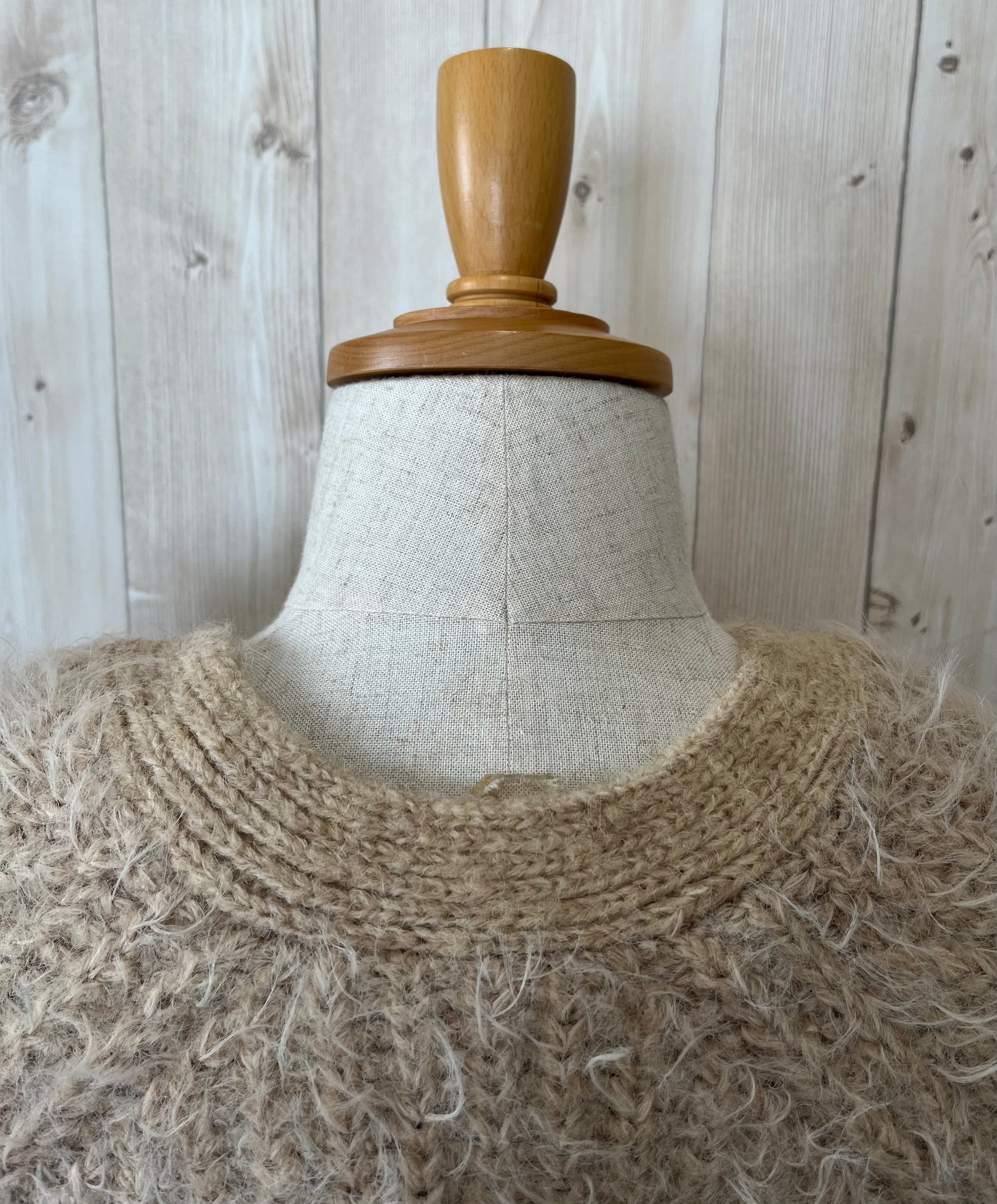ウール混の膨らみのある太糸と、毛足の長いナイロン糸を引き揃えて、片畦編みしています