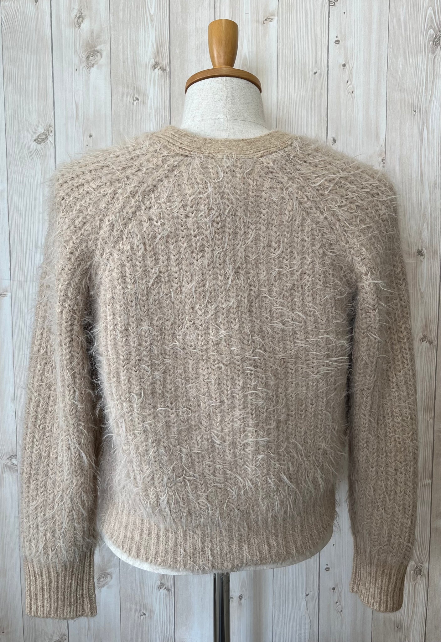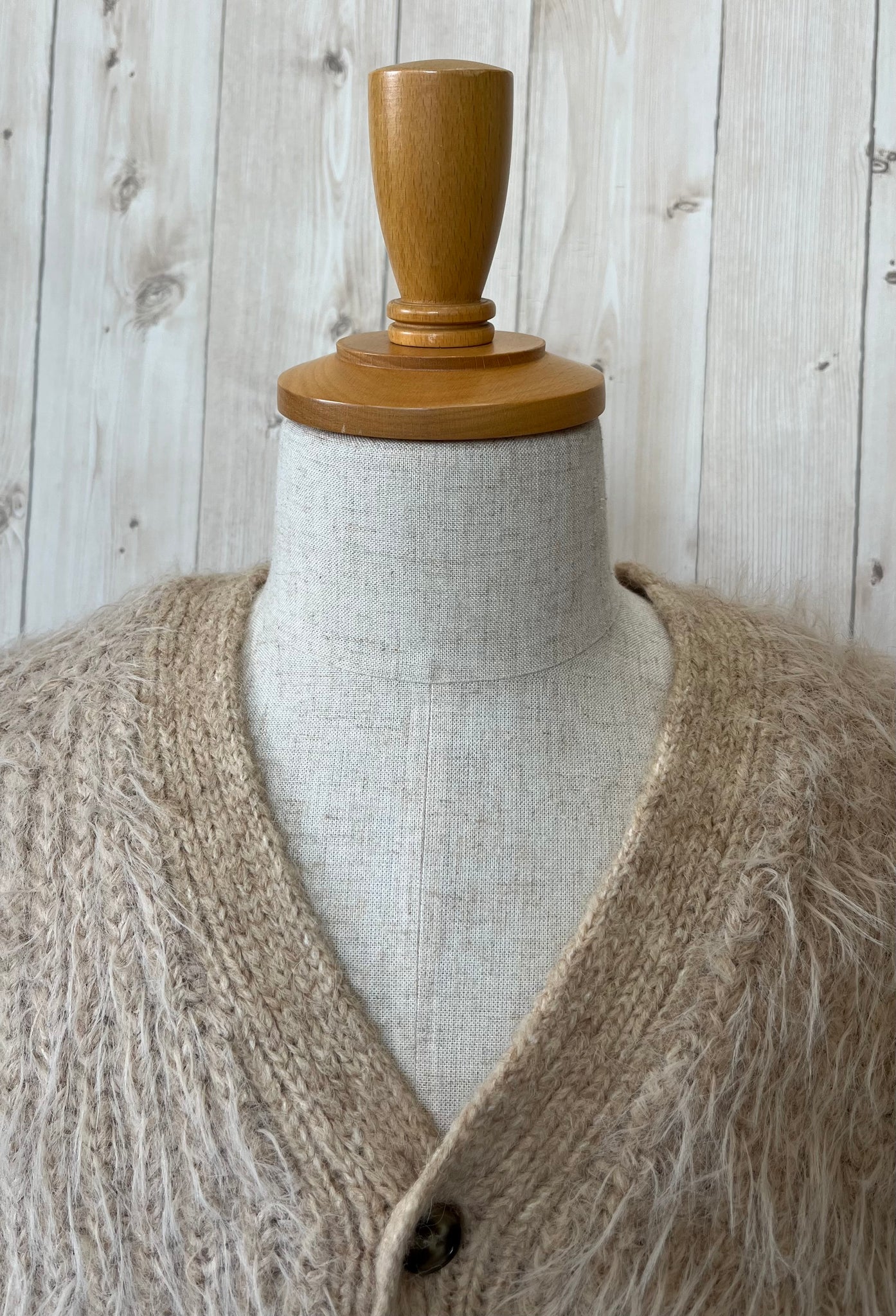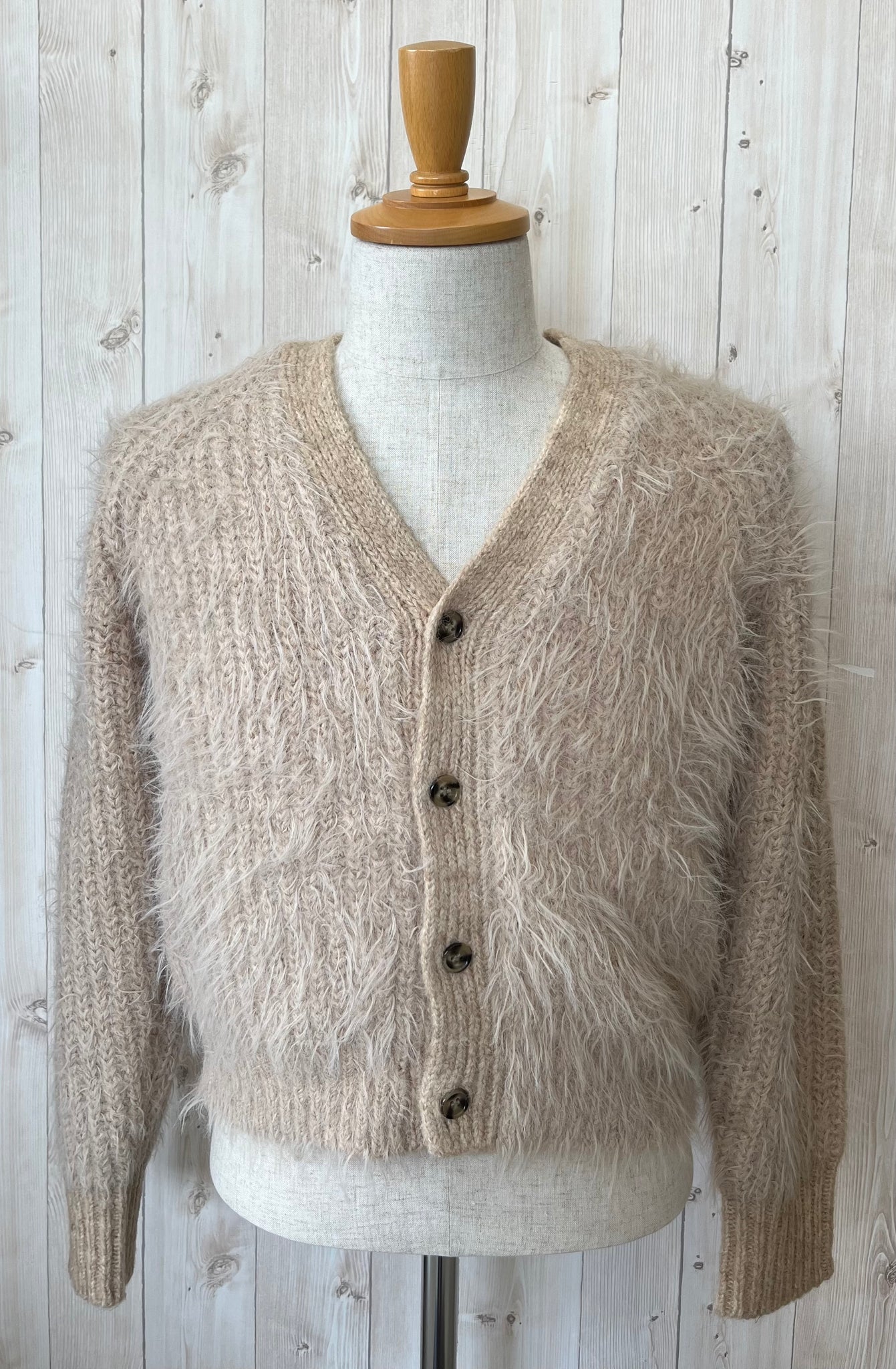 ウール混の膨らみのある太糸と、毛足の長いナイロン糸を引き揃えて、片畦編みしています