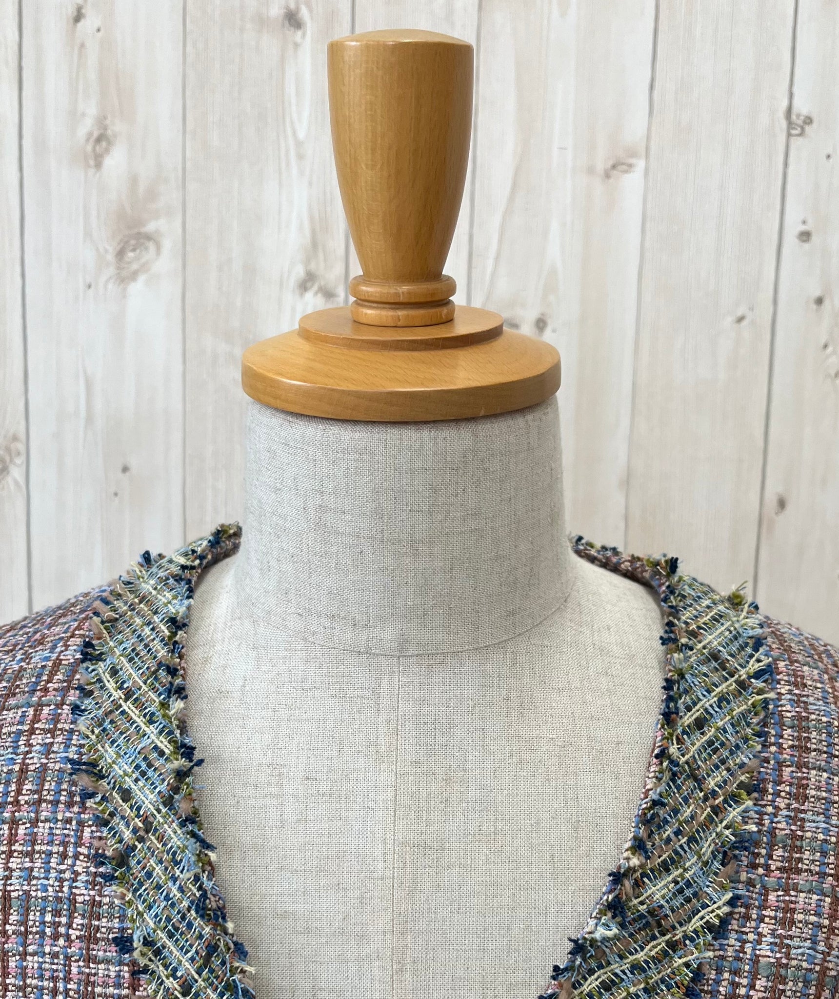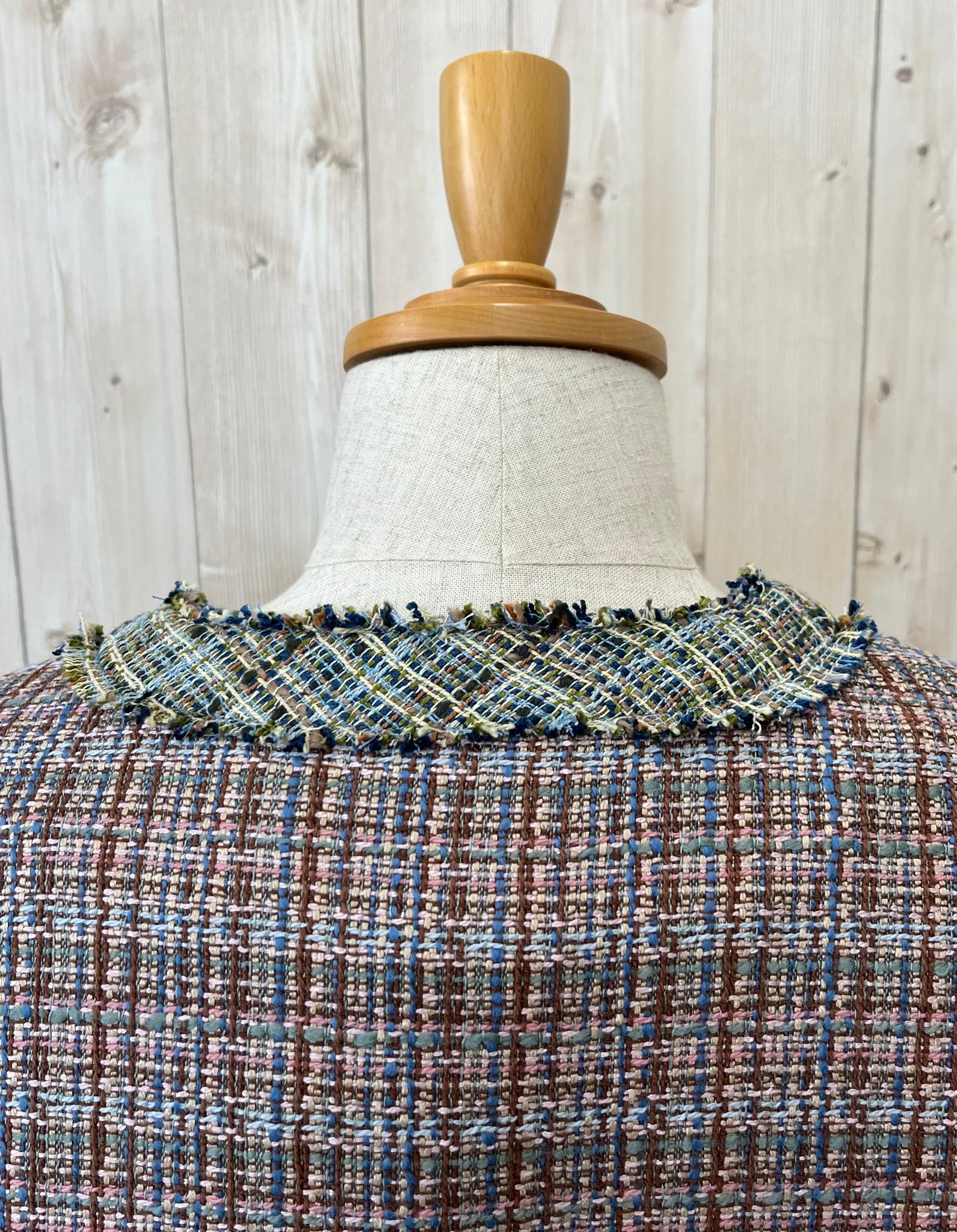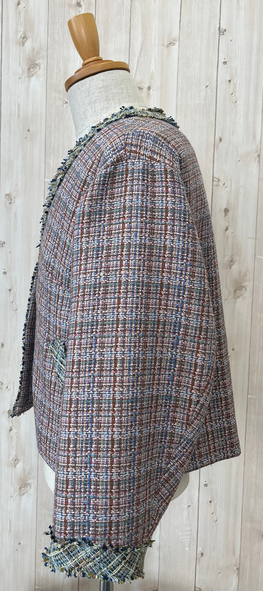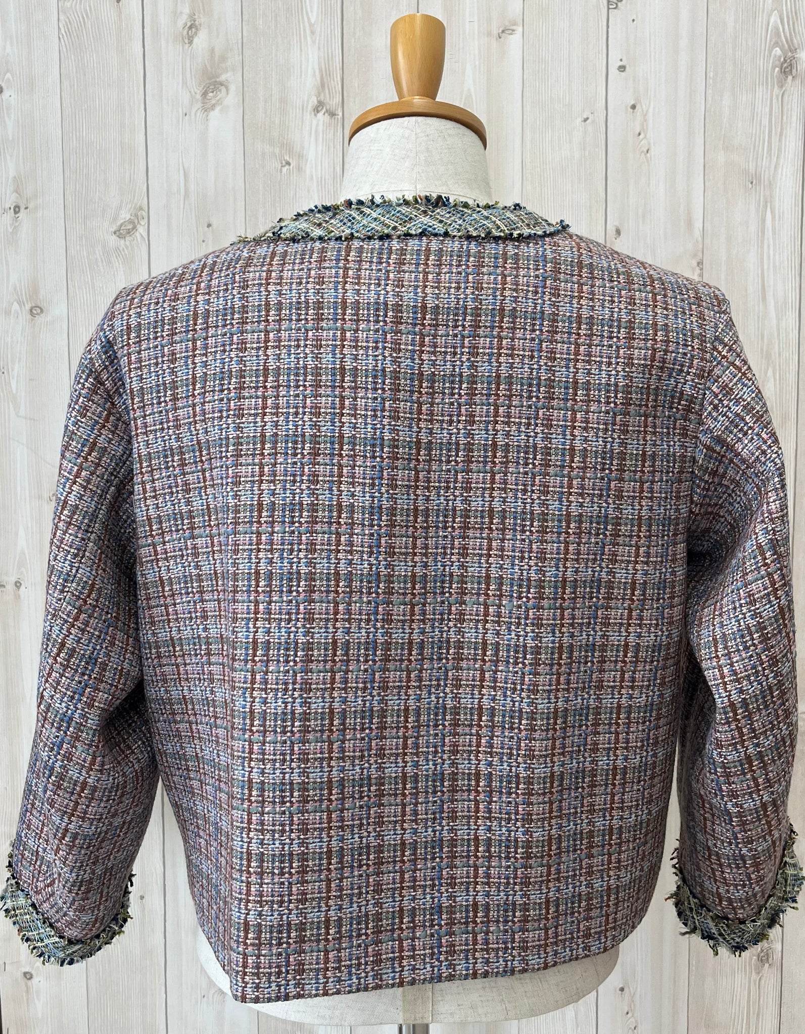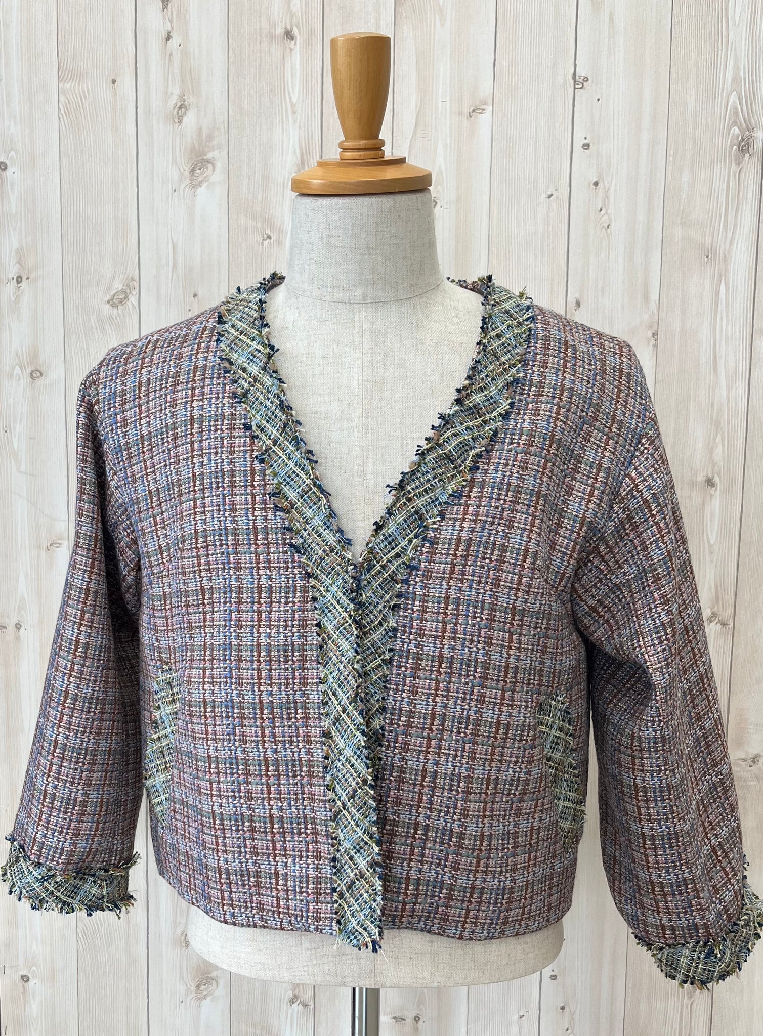光沢のあるレーヨンとマットなウール、スラブ糸のシンプルな糸の組み合わせのツィードジャケット