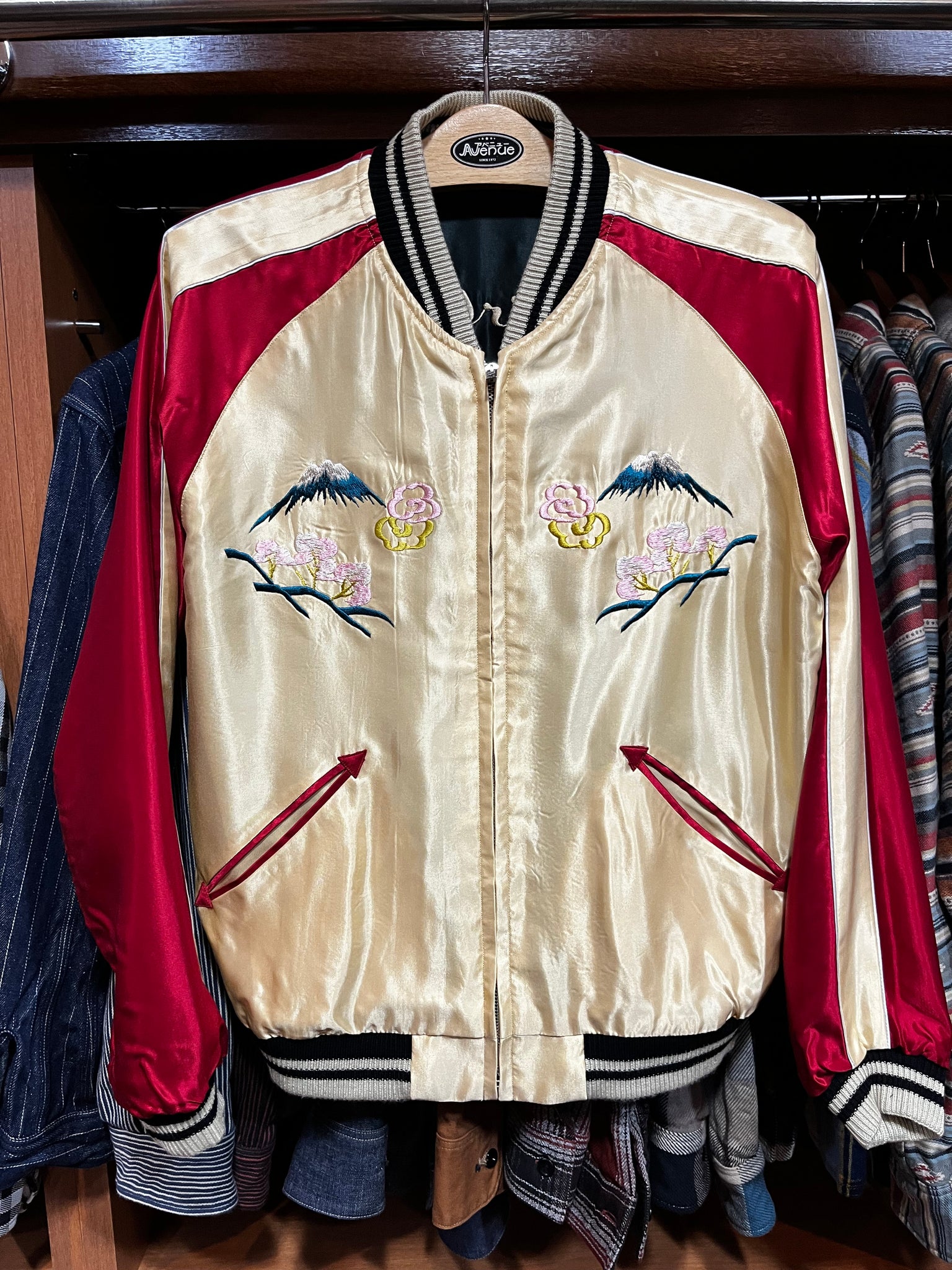 スーベニアジャケットのなかで最もスタンダードな両面にアセテート生地を使ったリバーシブルタイプ。戦後当時のスカジャンには、シルクに似た高級感を持つ物資統制外品目のアセテートが使われていた。中綿がないため季節を問わず着用でき、独特なドレープ感も魅力といえる。