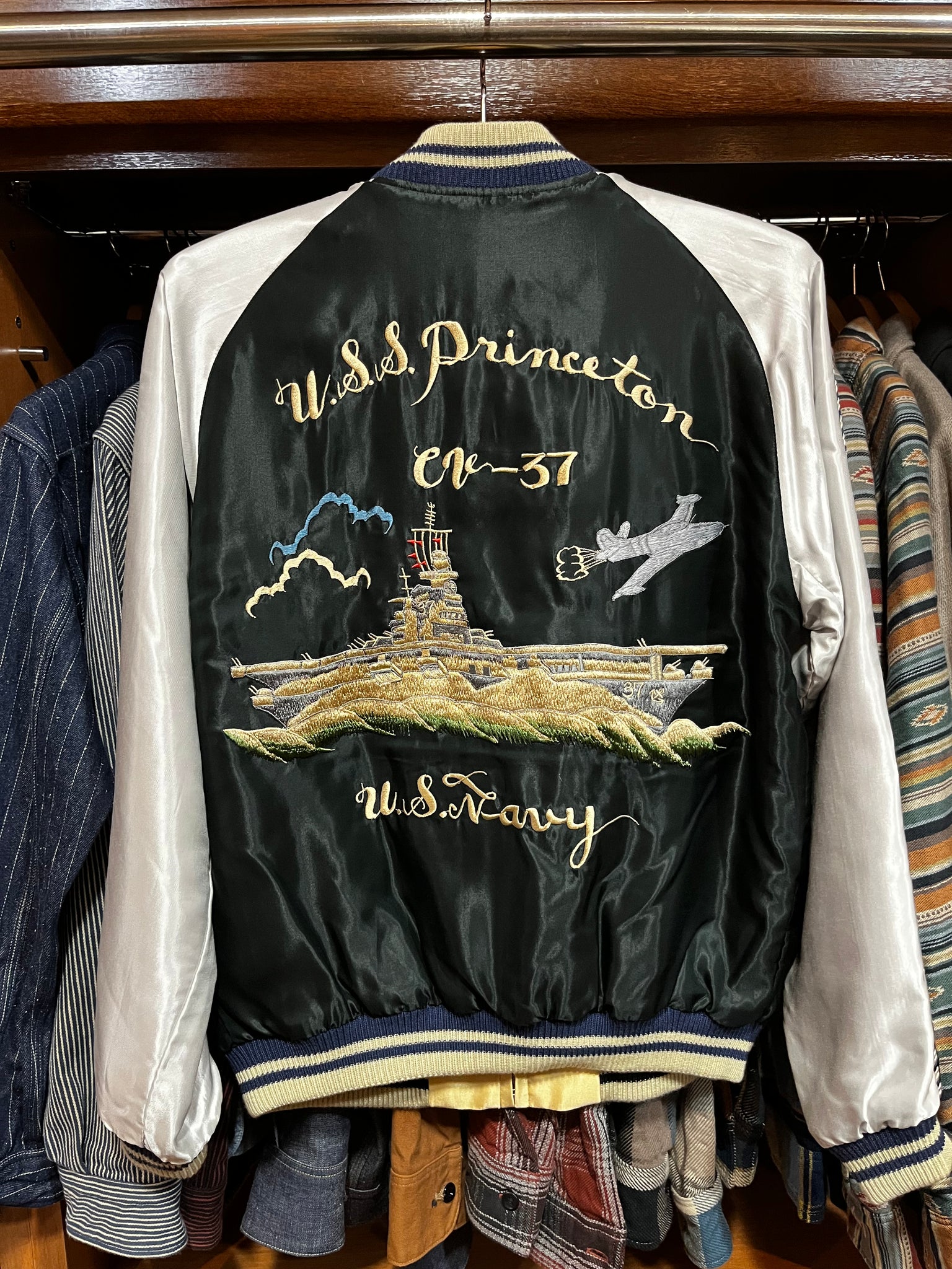 当時の生産数が少なく、ヴィンテージ市場でもレアなミリタリー柄のスカジャン。表面のモチーフとなっているのは、米海軍の航空母艦「プリンストン」。胸の第77機動部隊のマークと背中のCV-37の番号から、朝鮮戦争中の1950〜52年の間に日本へ訪れた際、同隊のためにカスタムオーダーされたものと断定できる。ブラック×シルバーのボディに対して袖のパイピングやリブにはネイビーが用いられており、全体がまとまりすぎないよう敢えて濃色同士のトーンをずらしているのもヴィンテージに倣った仕様。