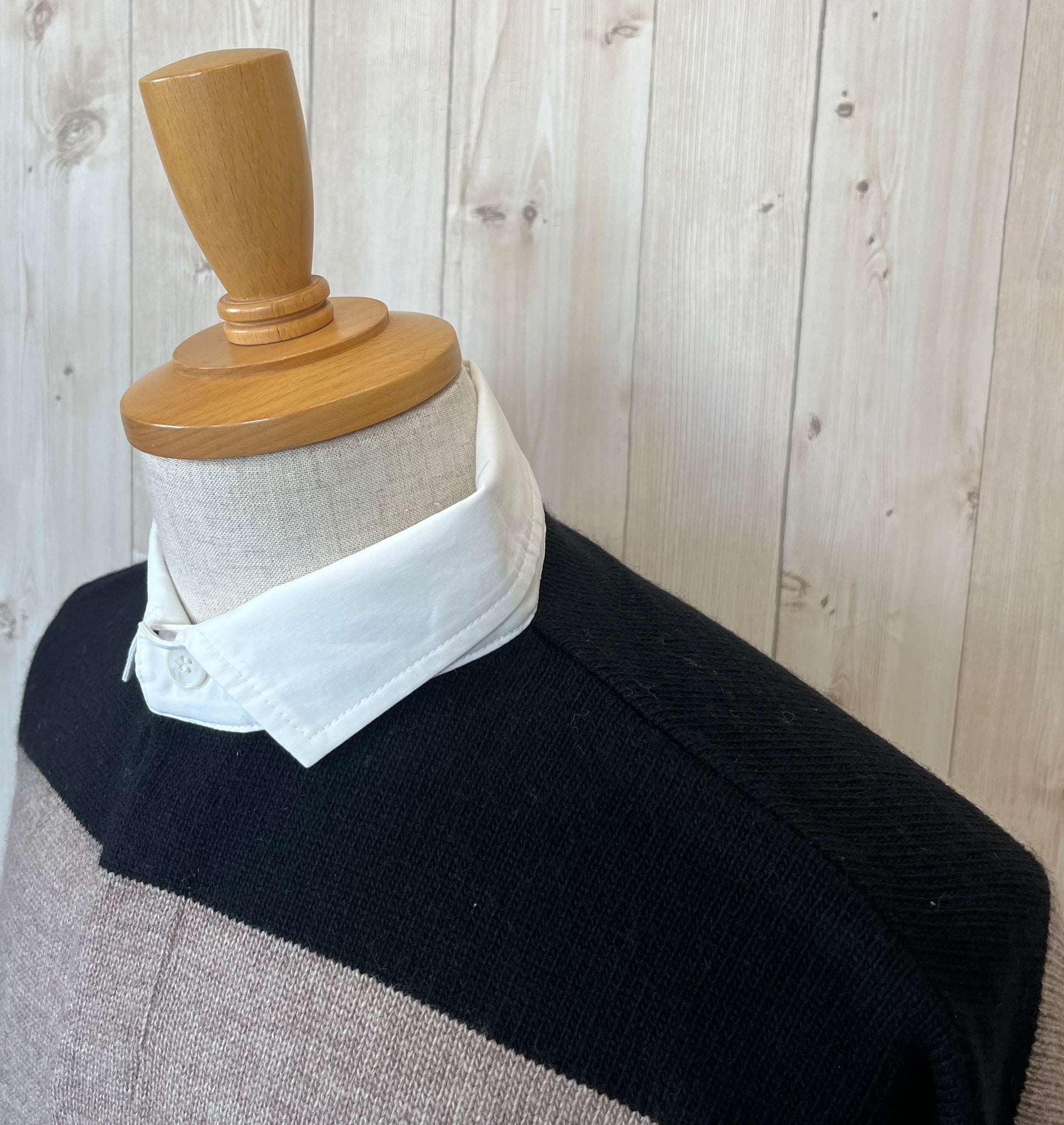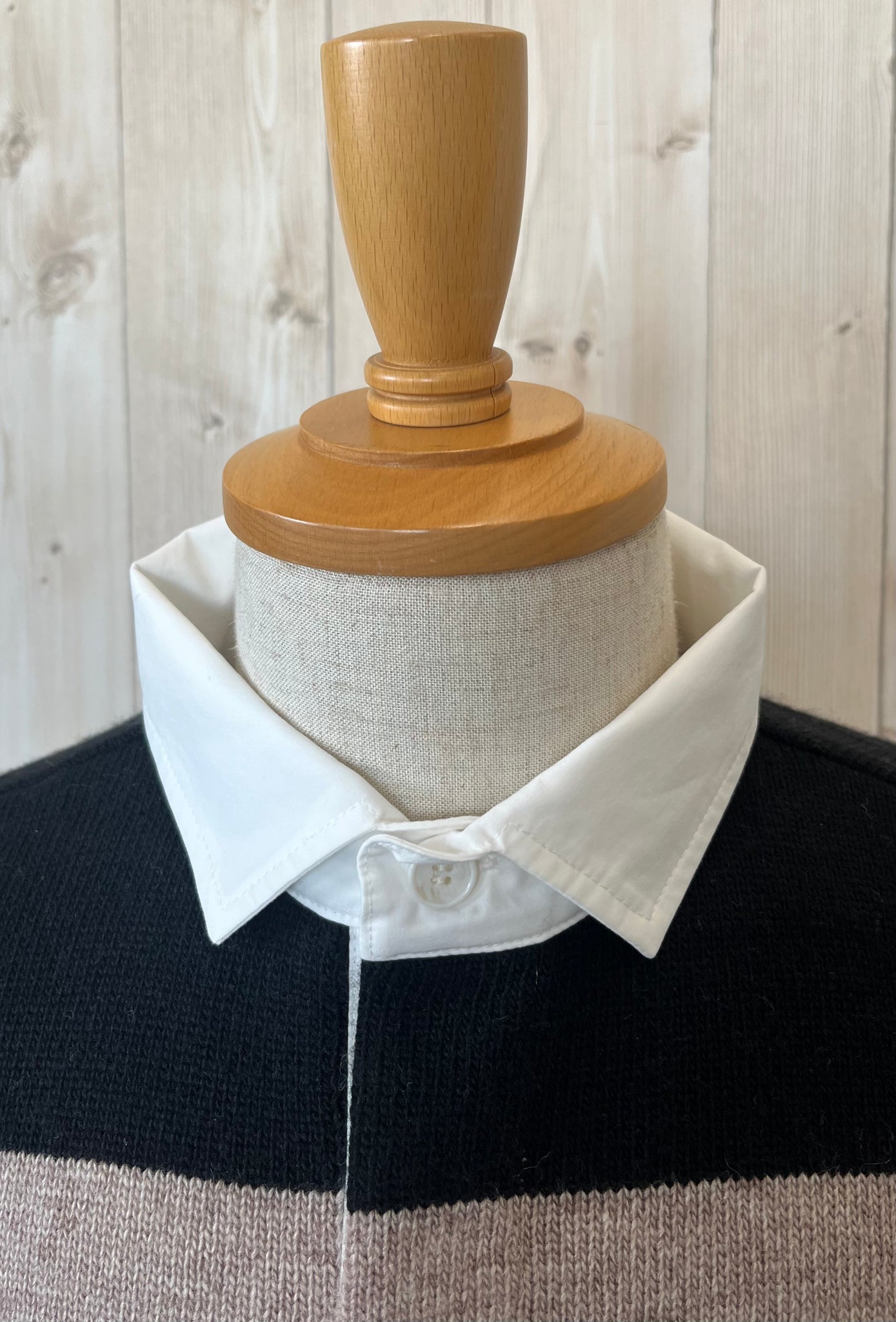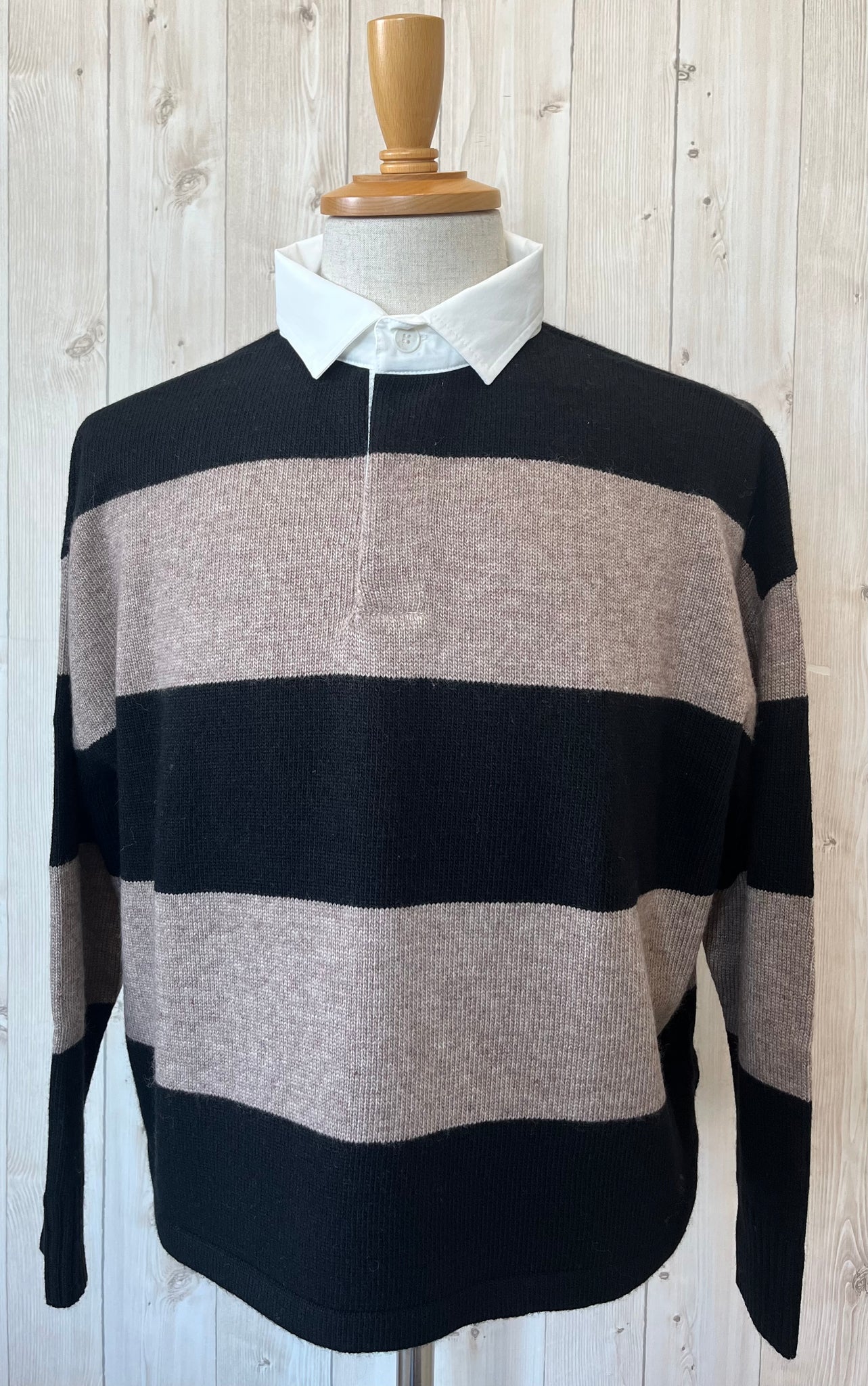 衿部分は布帛使いで、ラグビージャージのディテールを取り入れつつ、シルエットはオーバーサイズのドロップショルダーで今っぽいニュアンスに
