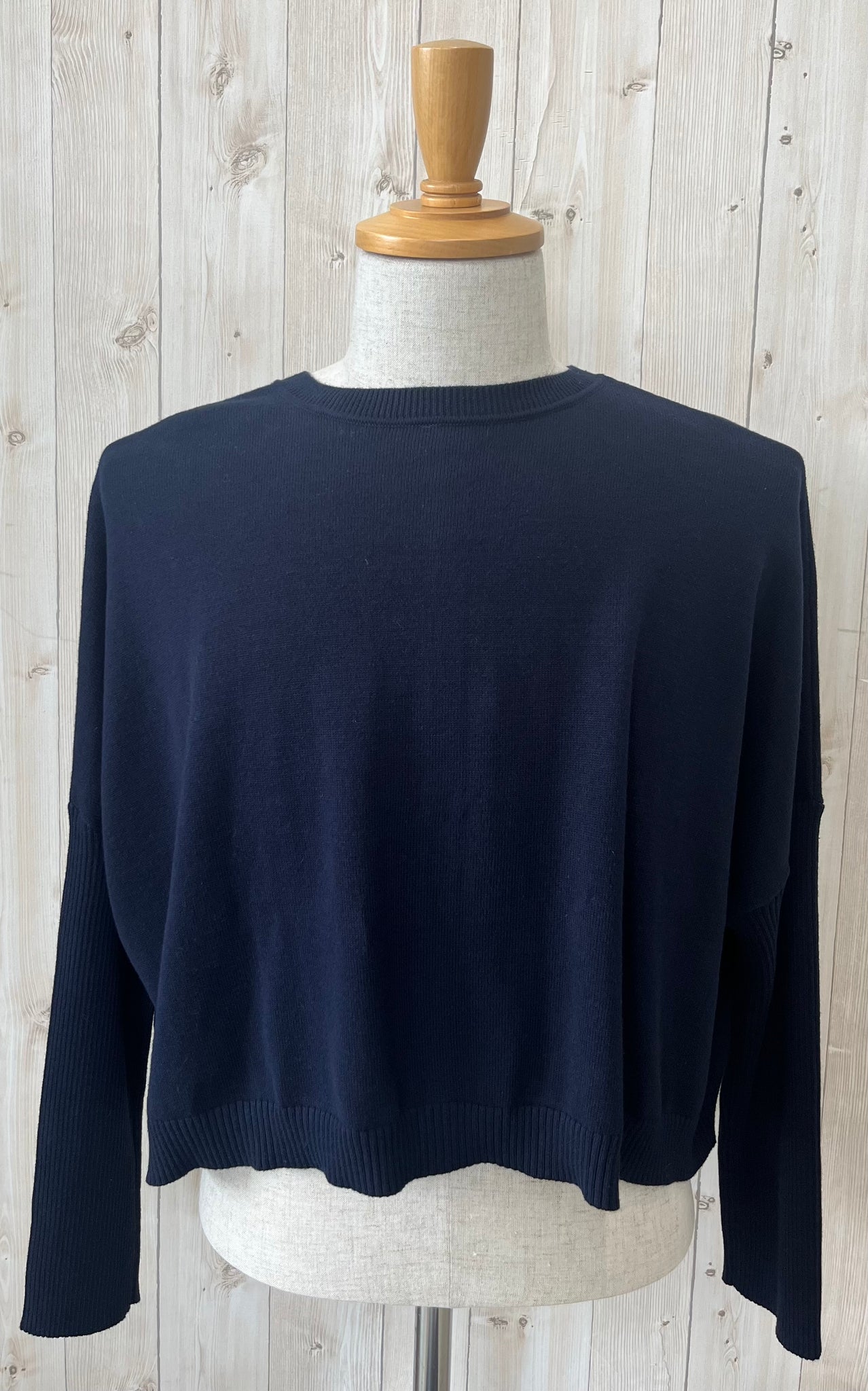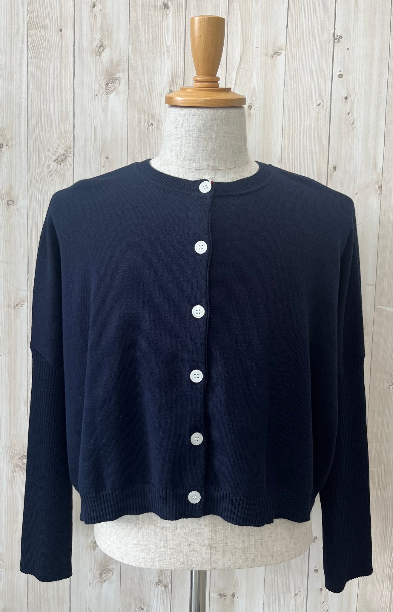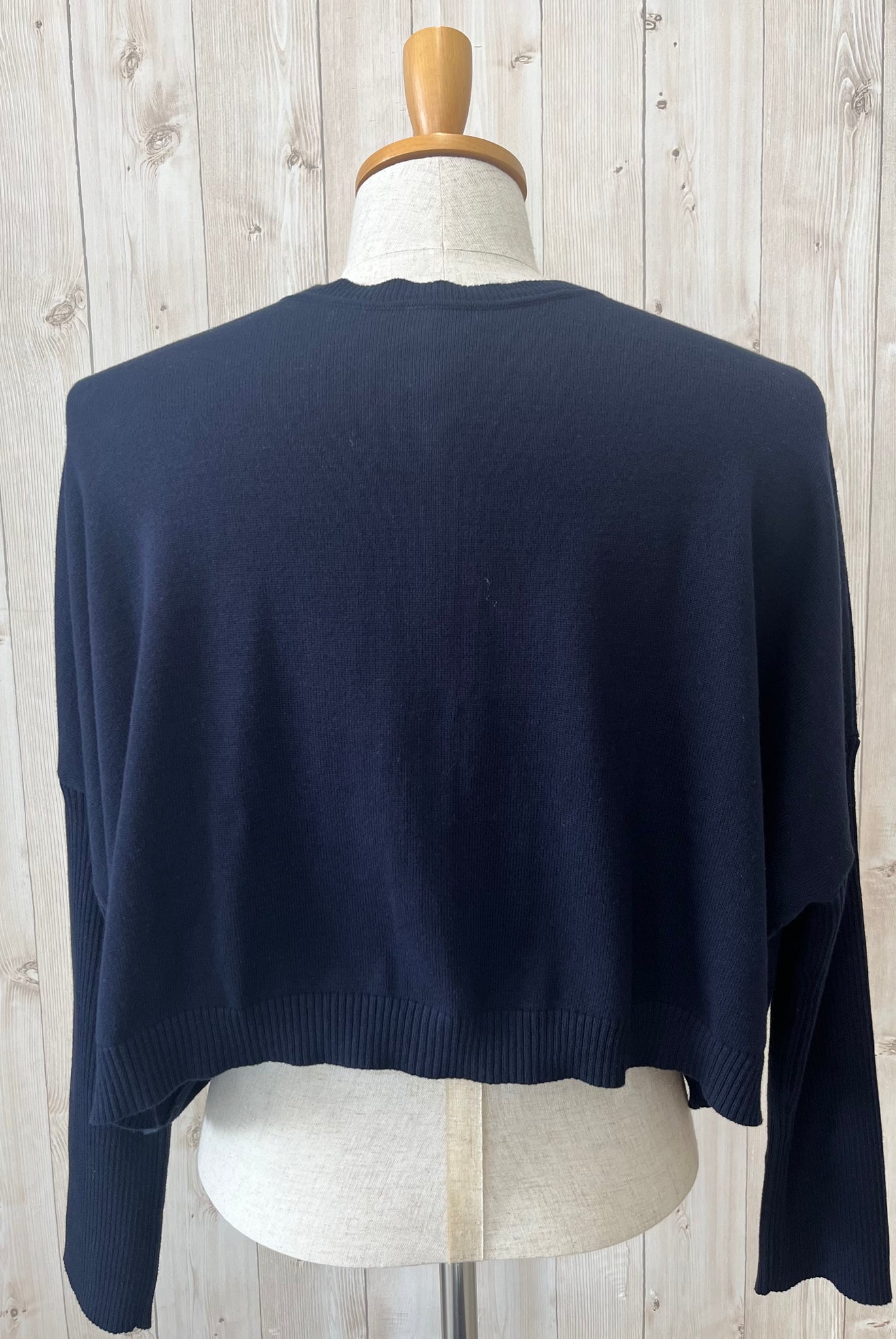 コンパクトな着丈、ゆったりな身幅にスッキリとした袖幅のRIB編みのお袖、着心地はゆったりなのにメリハリの効いたシルエットです