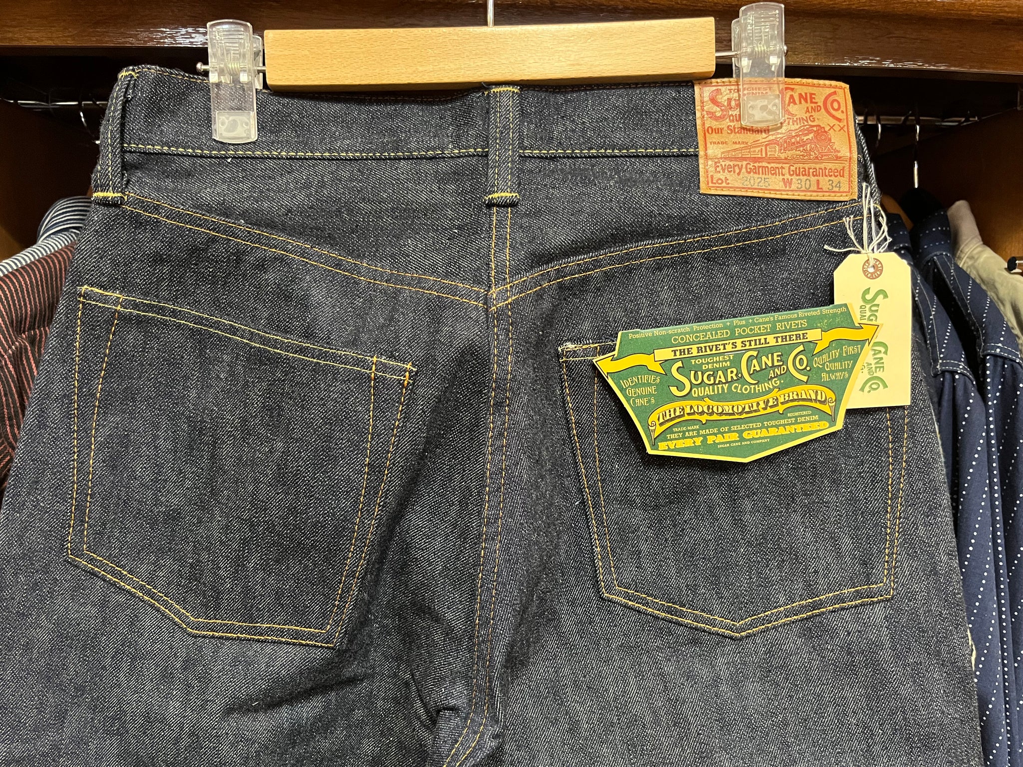 1936年モデルのデニムブラウスと同じ時代のウエストオーバーオールズをベースに、腿から裾までをワークパンツのように太めにアレンジした「2025年モデル」。当時はウエストにサスペンダー用ボタンやシンチバックが付けられるが、シュガーケーンオリジナルの仕様として本作では排除している。しかし股リベットや後中心の巻き縫いの方向(右高)は戦前モデルの仕様を踏襲。生地は前項のデニムブラウス同様に未熟な紡績のムラ糸を再現しており、荒々しい色落ちやエイジングに期待できる。このモデルには新たに製作したグリーンのフラッシャーが付けられる。