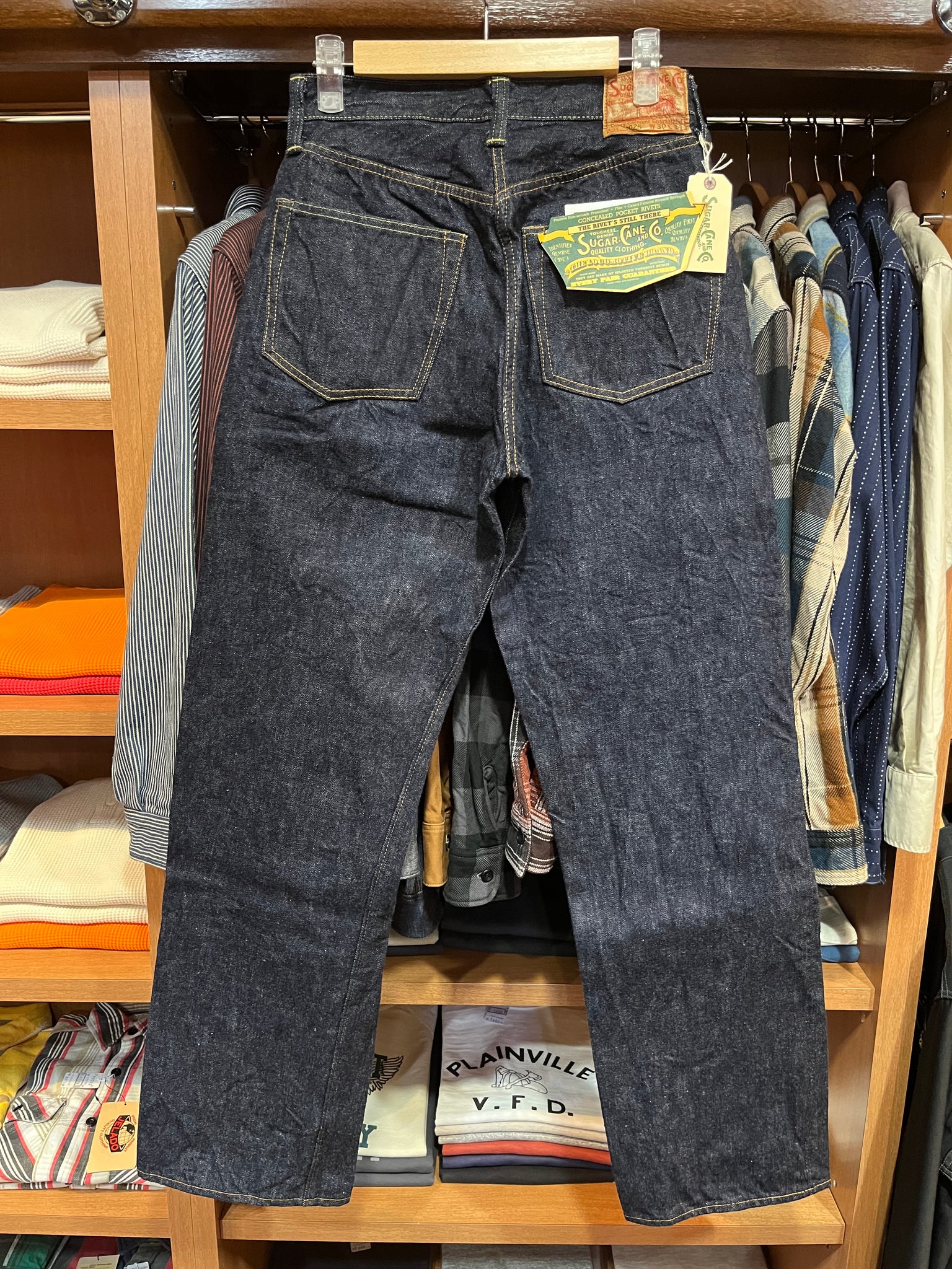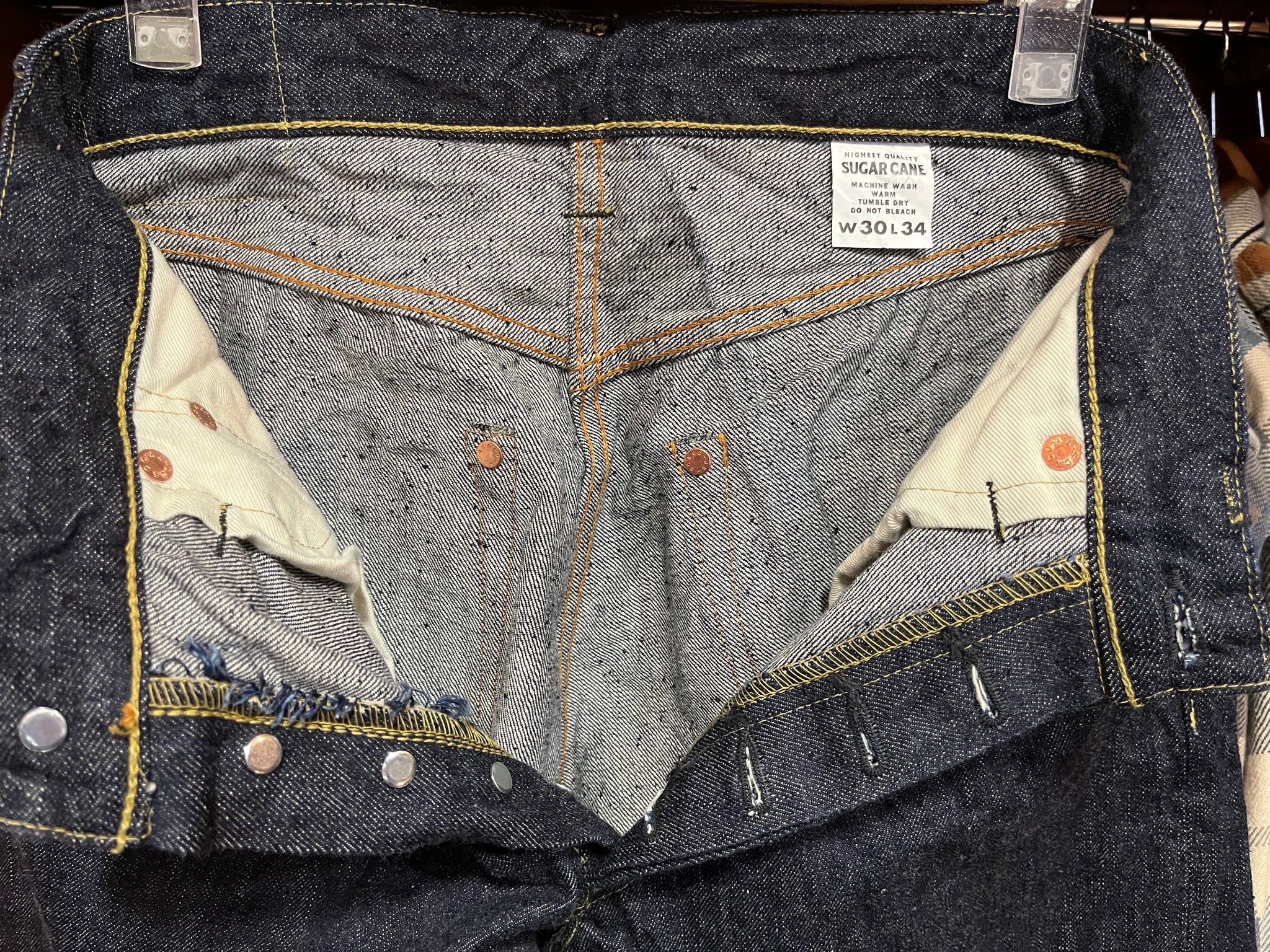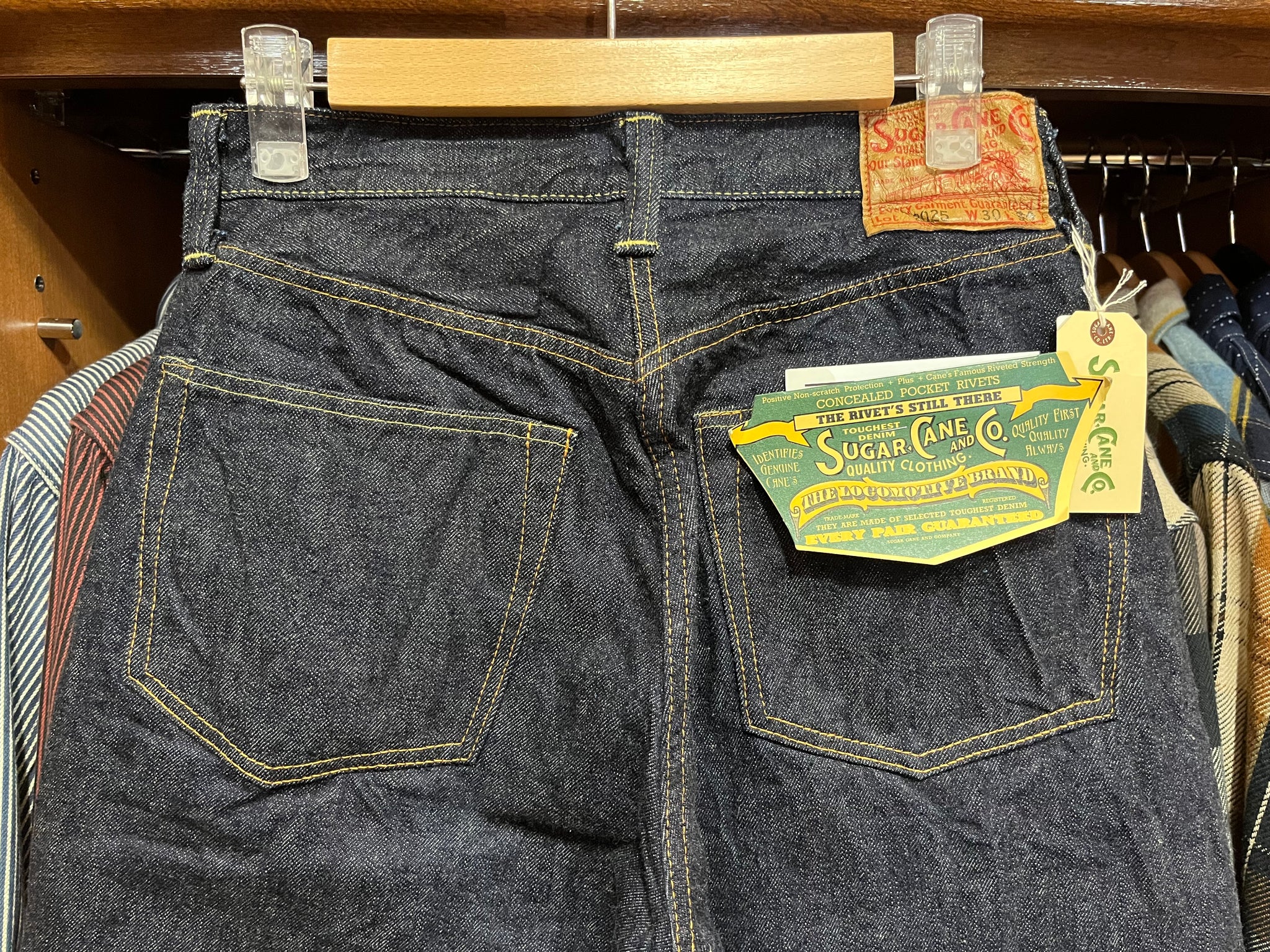 1936年モデルのデニムブラウスと同じ時代のウエストオーバーオールズをベースに、腿から裾までをワークパンツのように太めにアレンジした「2025年モデル」。当時はウエストにサスペンダー用ボタンやシンチバックが付けられるが、シュガーケーンオリジナルの仕様として本作では排除している。しかし股リベットや後中心の巻き縫いの方向(右高)は戦前モデルの仕様を踏襲。生地は前項のデニムブラウス同様に未熟な紡績のムラ糸を再現しており、荒々しい色落ちやエイジングに期待できる。このモデルには新たに製作したグリーンのフラッシャーが付けられる。