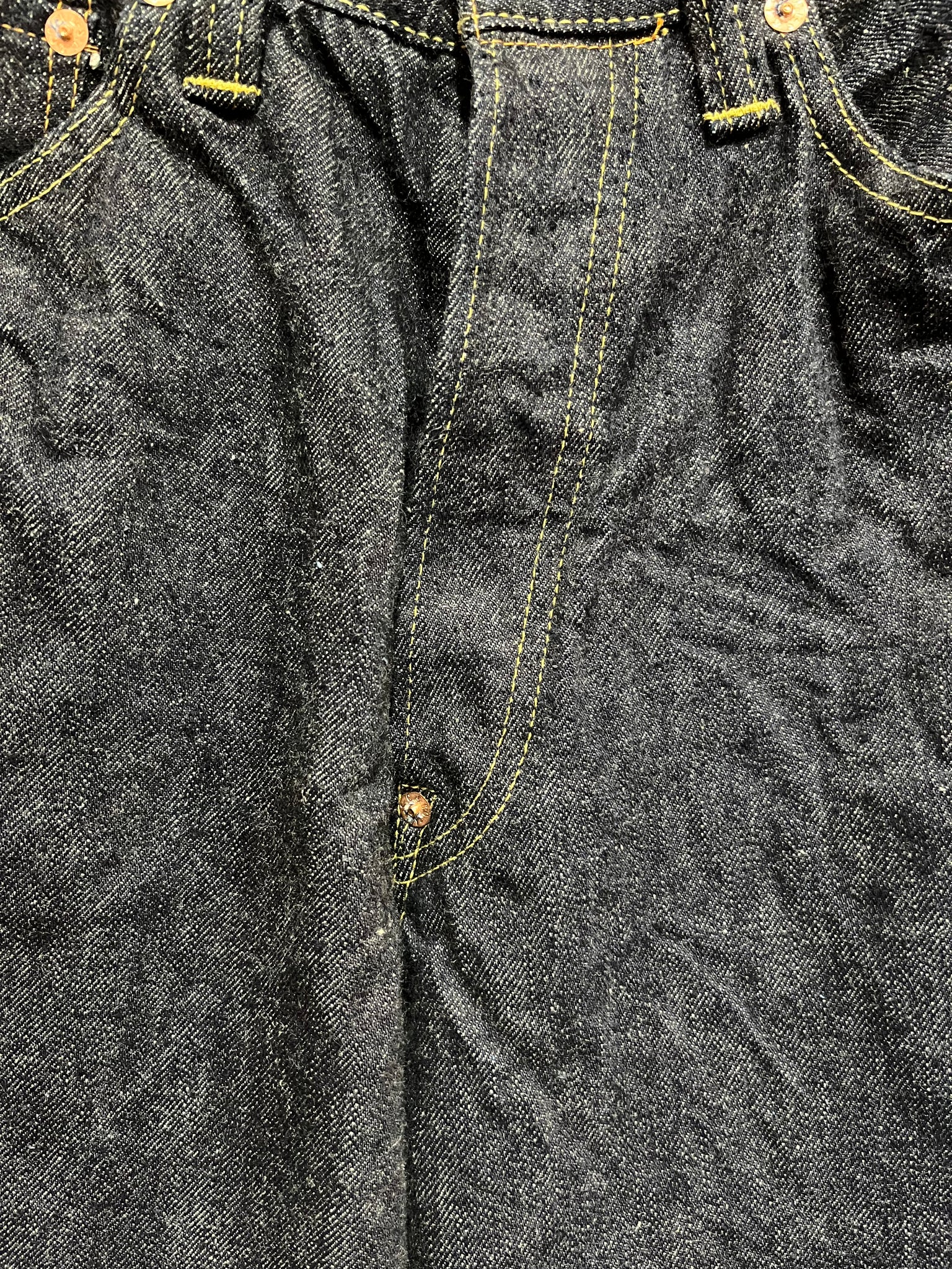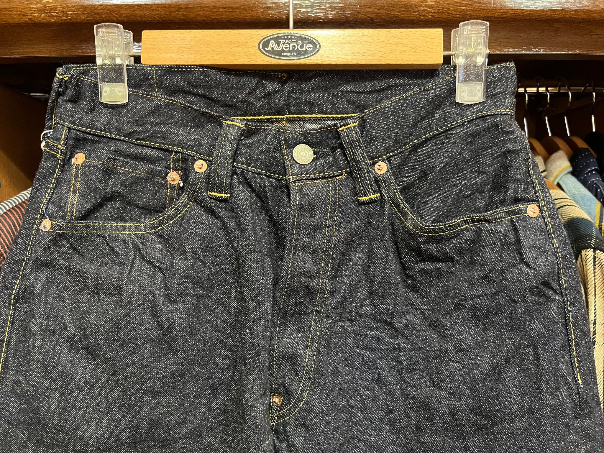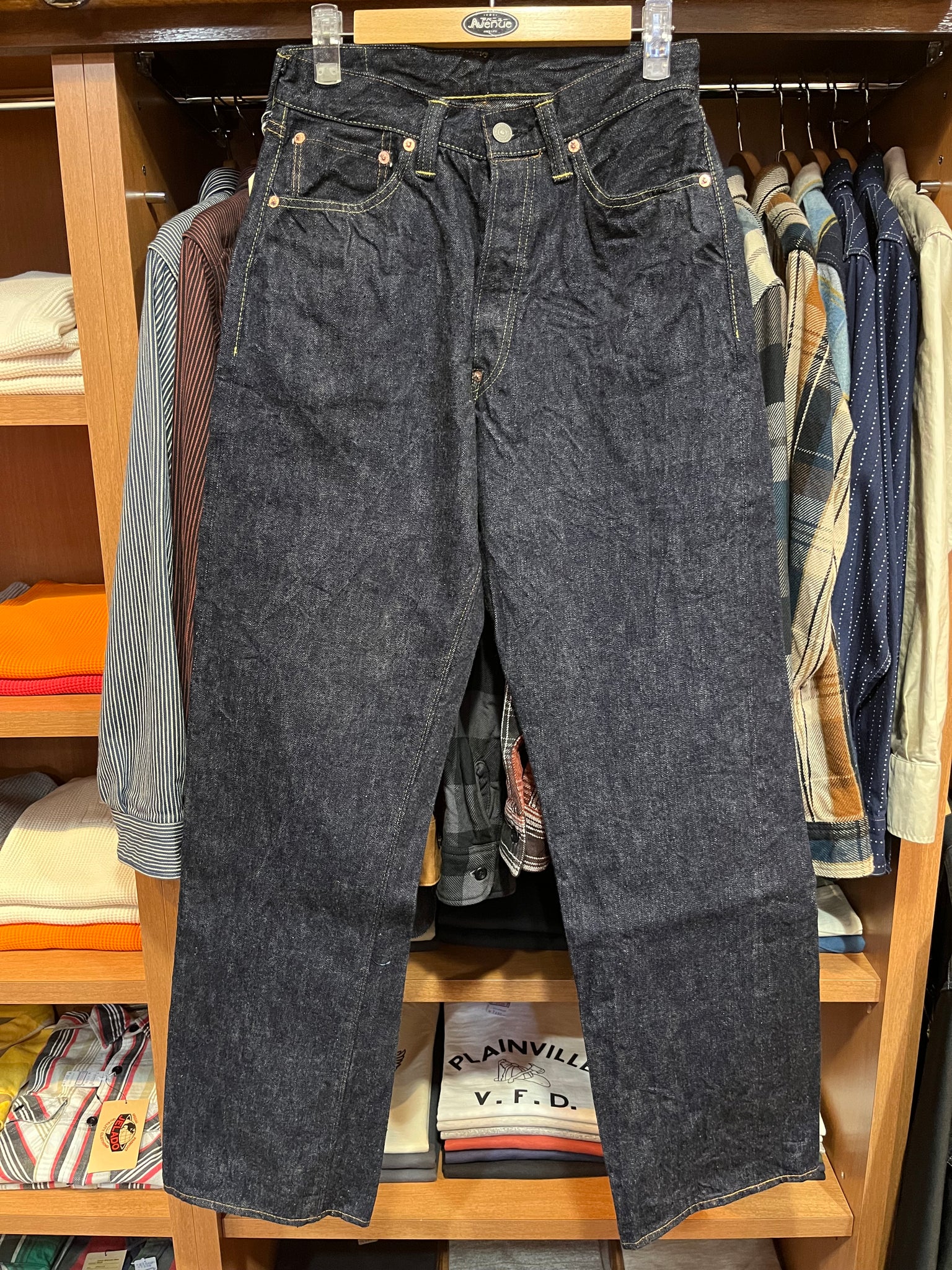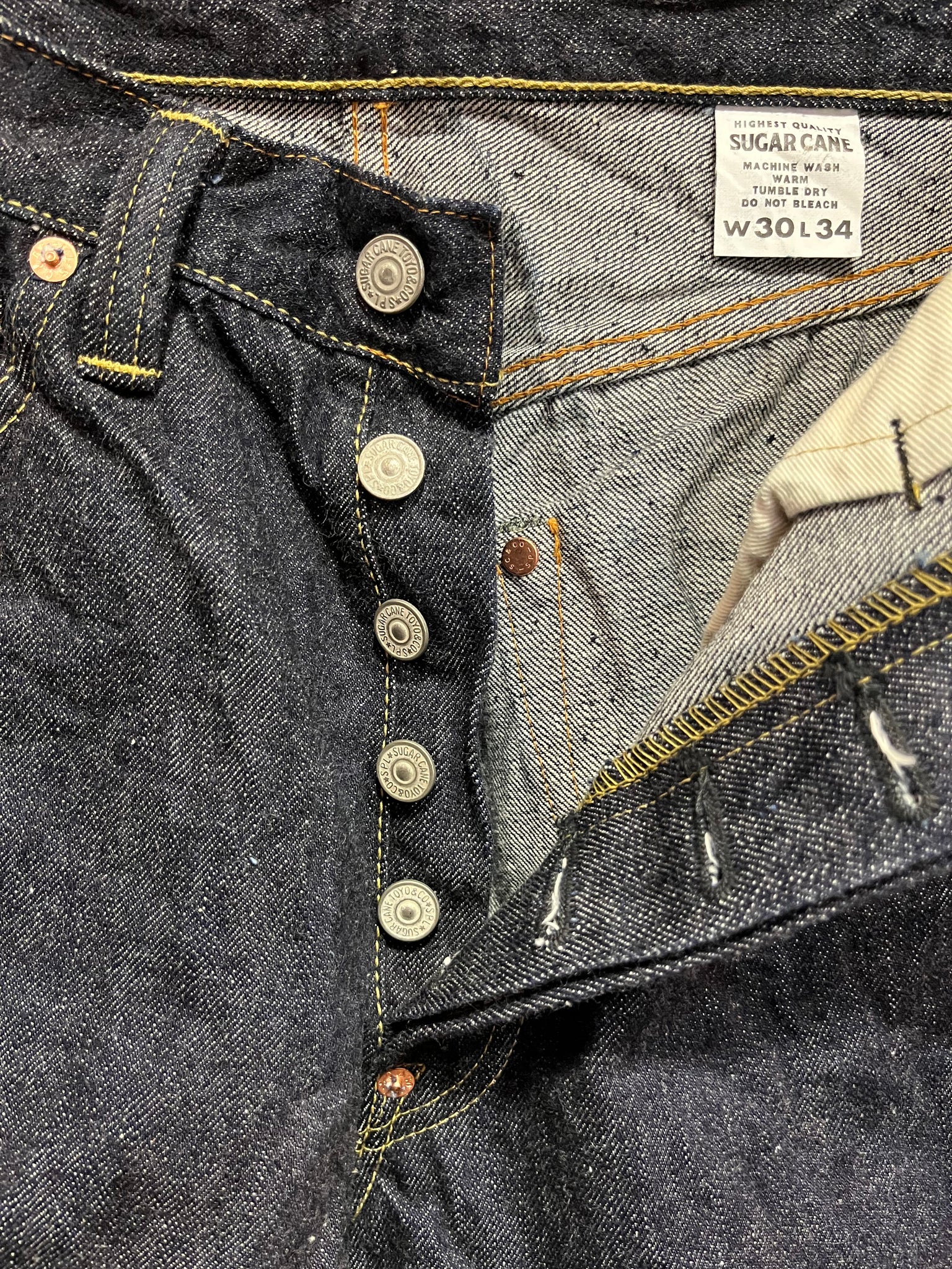 1936年モデルのデニムブラウスと同じ時代のウエストオーバーオールズをベースに、腿から裾までをワークパンツのように太めにアレンジした「2025年モデル」。当時はウエストにサスペンダー用ボタンやシンチバックが付けられるが、シュガーケーンオリジナルの仕様として本作では排除している。しかし股リベットや後中心の巻き縫いの方向(右高)は戦前モデルの仕様を踏襲。生地は前項のデニムブラウス同様に未熟な紡績のムラ糸を再現しており、荒々しい色落ちやエイジングに期待できる。このモデルには新たに製作したグリーンのフラッシャーが付けられる。