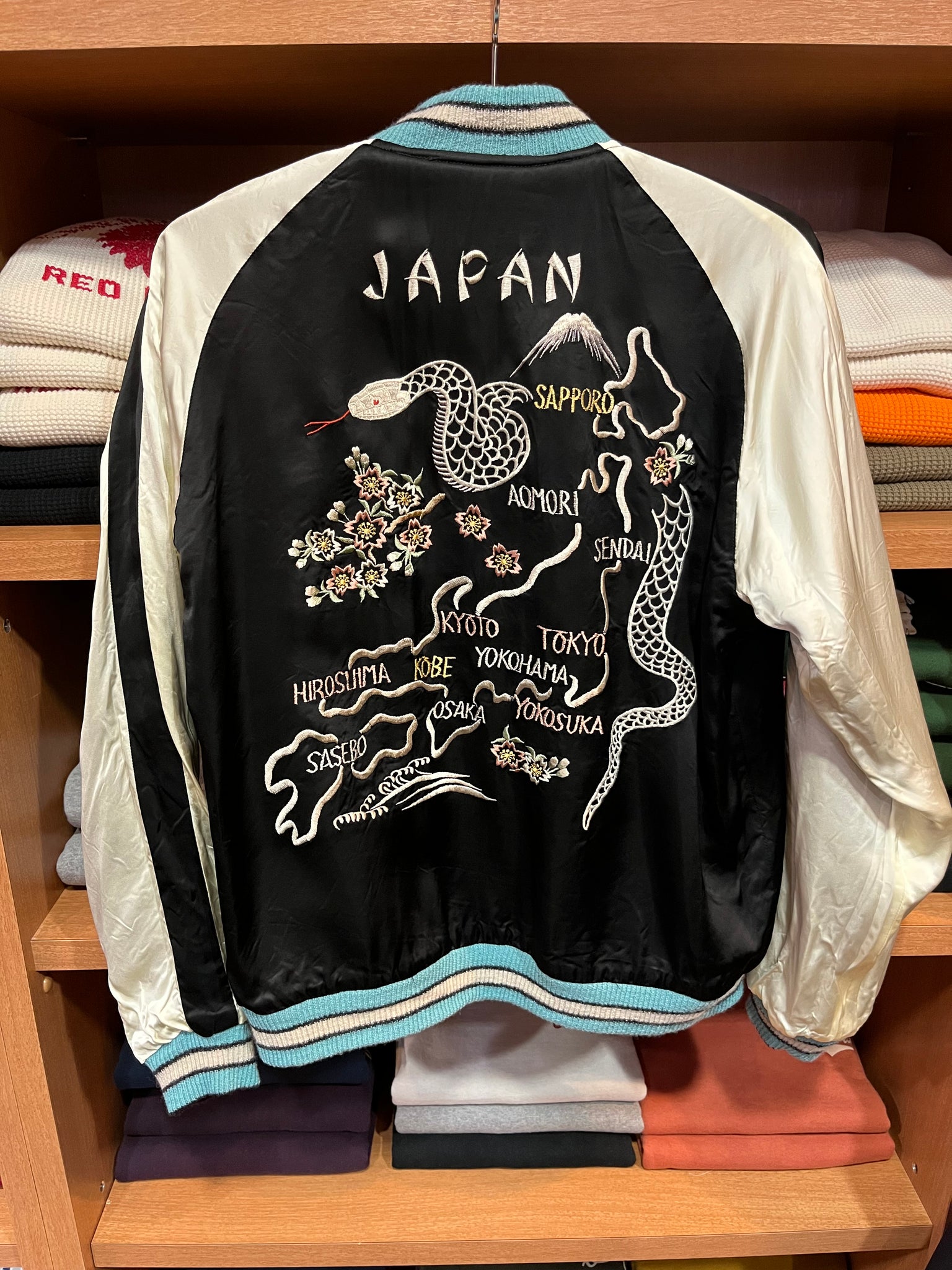 リバーシブル面は春をイメージし、咲き誇る桜に囲まれたジャパンマップ、そして日本を守るかのように巻き付く白蛇を描いている。ヘビの鱗の描写に注目すると、表面では横振り刺繍を重ねることで陰影を表現していたが、裏面では刺繍を抜いて地色のブラックを活かし、立体感を表現している。リブにはヴィンテージでも珍しいターコイズブルーのリブを採用。長年培ってきたヴィンテージ復刻の経験に裏打ちされたオリジナリティあふれるデザインに仕上がっている。