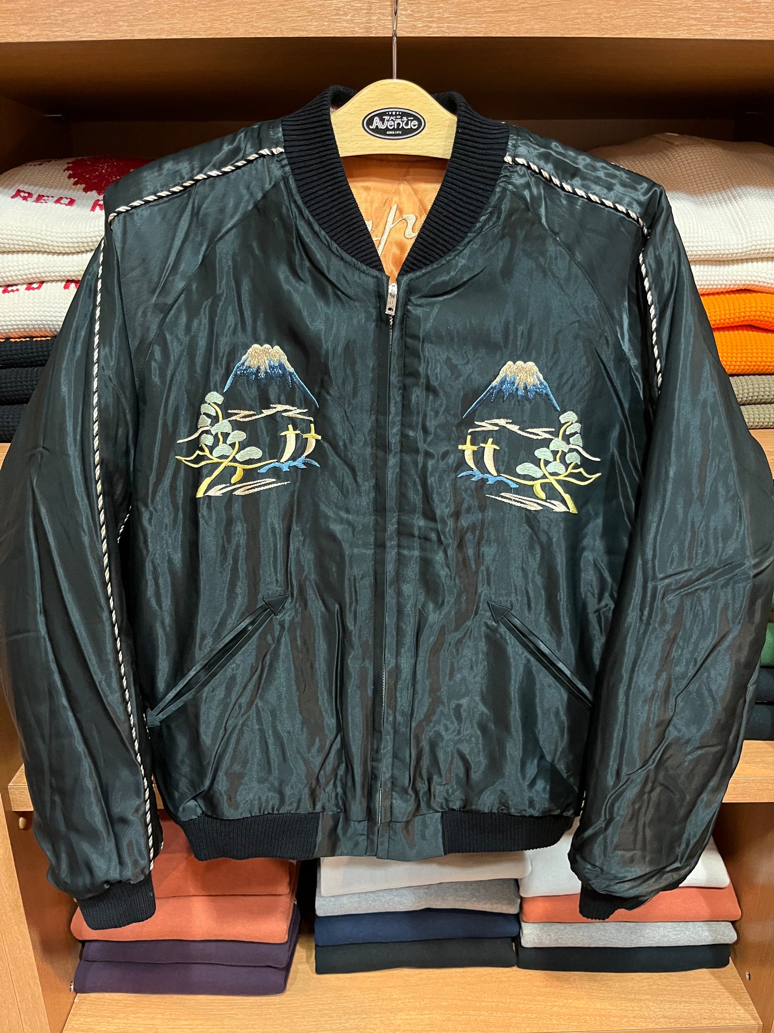リバーシブル面は、黒一色のボディにブルーやピンクなどカラフルな淡い色糸で日本の風景を描いたランドスケープ柄。モチーフは冬の風景で、胸には富士山と松、背中には龍やオリエンタルな仏塔、松の木の根元に佇む鹿を刺繍。当時の米兵にとって、スカジャンは祖国に持ち帰りたくなる魅力的な風景画でもあった。