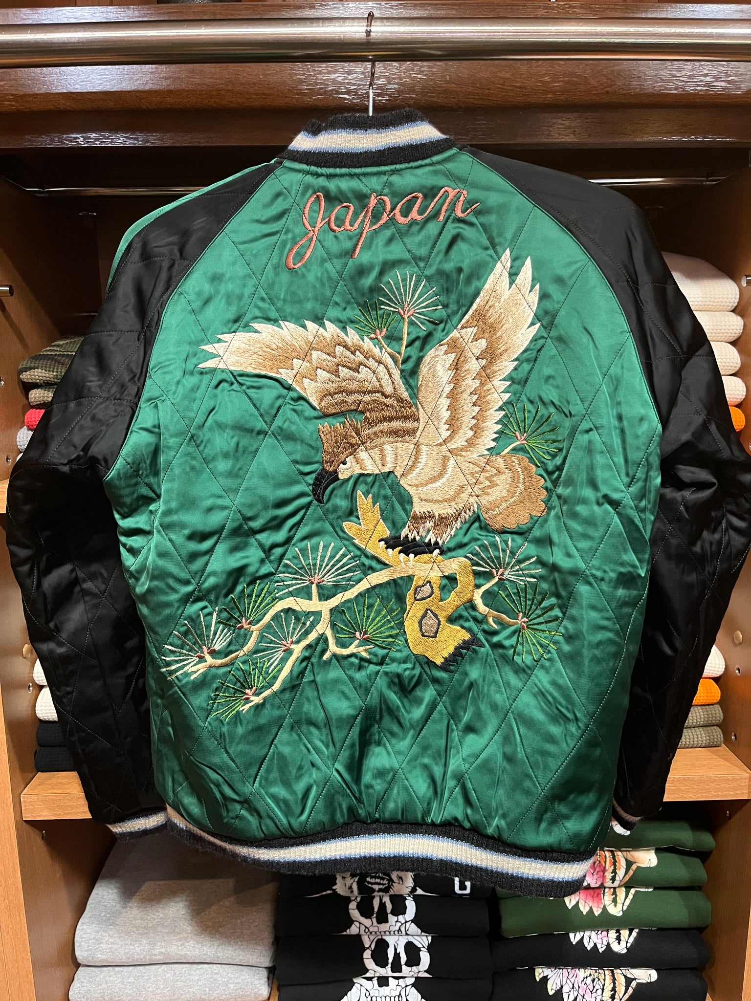 リバーシブル面は、身頃よりも袖下の色が濃い「逆配色」。鮮やかなグリーンのボディに描かれるのは、翼を広げた鷲、そして立派な枝ぶりの松の木。盆栽などにも通じる、力強い樹形を鑑賞して愛でる日本の美が表現されている。当時も今も、職人の卓越した技術がなければ生み出せない圧巻の作品。