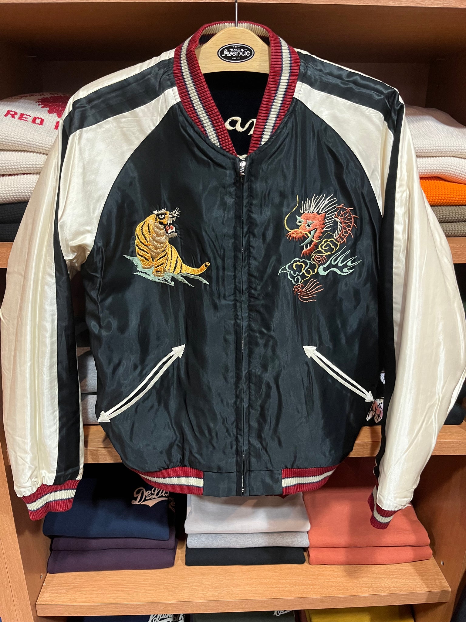 リバーシブル面は富士山を背景に、ほどよくデフォルメされた鷲が海上を滑空する絵柄。胸には龍虎、背中には鷲とスカジャンの三大モチーフが揃った贅沢な一着。ブラック×オフホワイトのボディに対し、こちらもリブの赤で全体をまとめている。